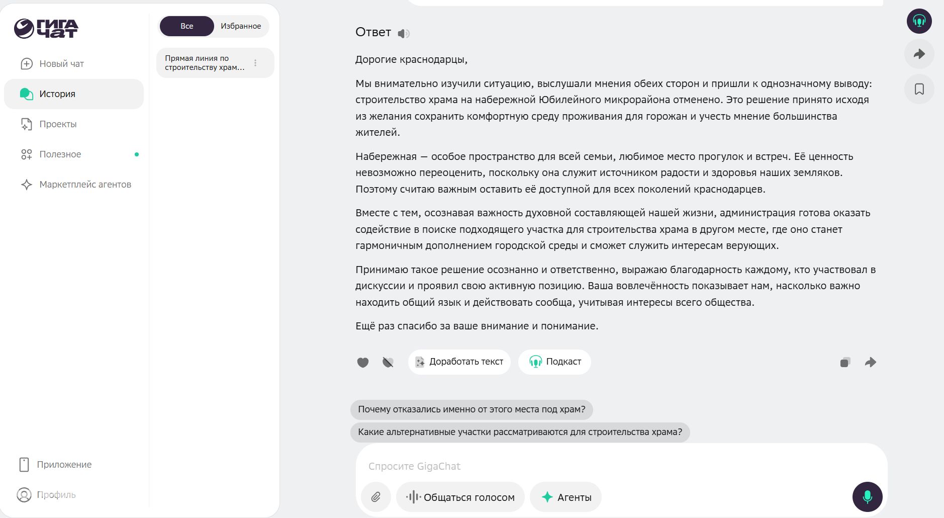 Итак, редактор Юга.ру Денис Куренов, вооруженный естественным интеллектом, поговорил с противоестественным интеллектом нейросети GigaChat. Алгоритму была поставлена задача: вжиться в роль Вениамина Кондратьева и провести виртуальную прямую линию с единственным журналистом. В повестке — храм в Юбилейном, разливы мазута, судьба WhatsApp*, краснодарские пробки и даже «Твин Пикс».