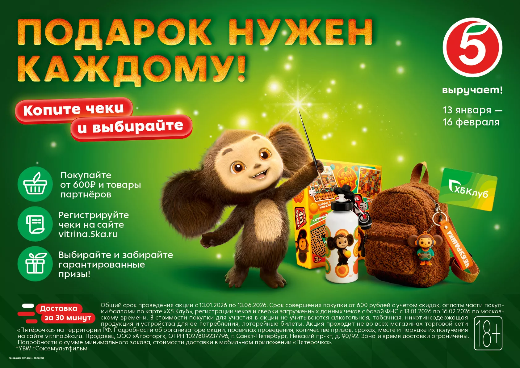 Акция «Подарок нужен каждому!» действует с 13 января по 16 февраля 2026 года во всех магазинах «Пятёрочка» и в сервисе доставки по всей России, кроме Дальнего Востока. Подробные условия — на сайте vitrina.5ka.ru.