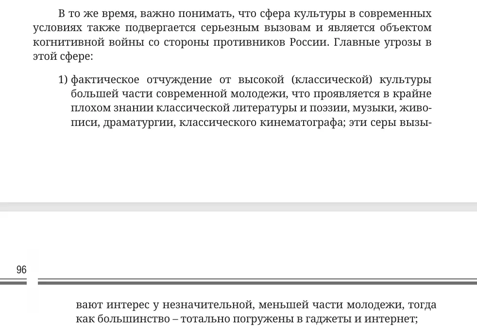 В кинематографе также царит эклектика. Наряду с фильмами «Белый тигр», «Солнцепек» и «Шугалей» (последние два прославляют ЧВК «Вагнер» Евгения Пригожина), для воспитания традиционных ценностей школьникам предлагают смотреть голливудские блокбастеры. Например, «Адвокат дьявола» с Киану Ривзом и Аль Пачино (видимо, чтобы отвадить от карьеры юриста) или триллер «На грани» с Энтони Хопкинсом.
