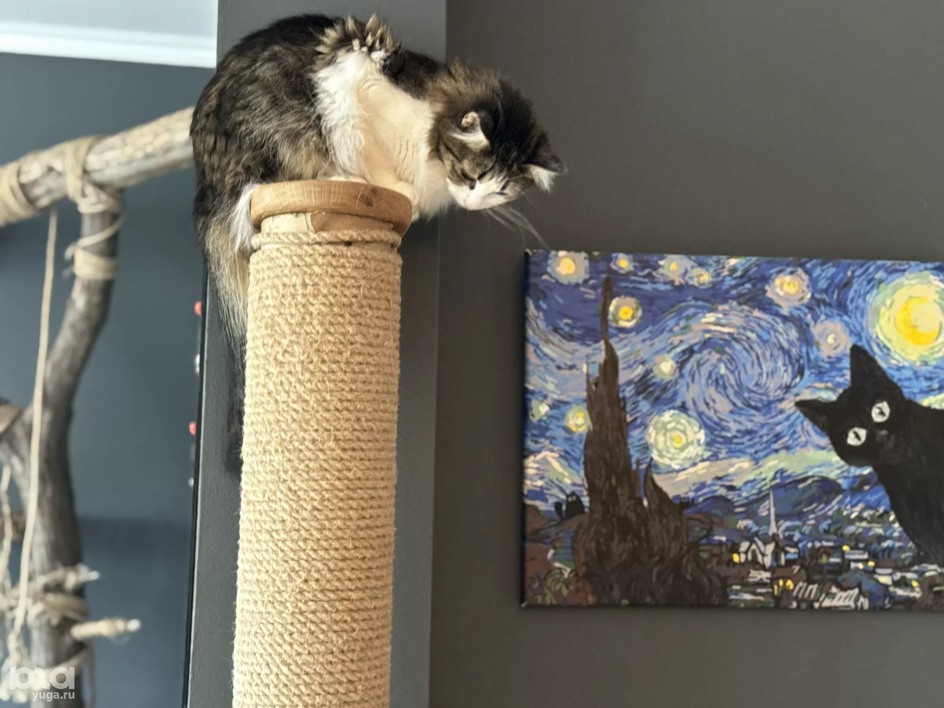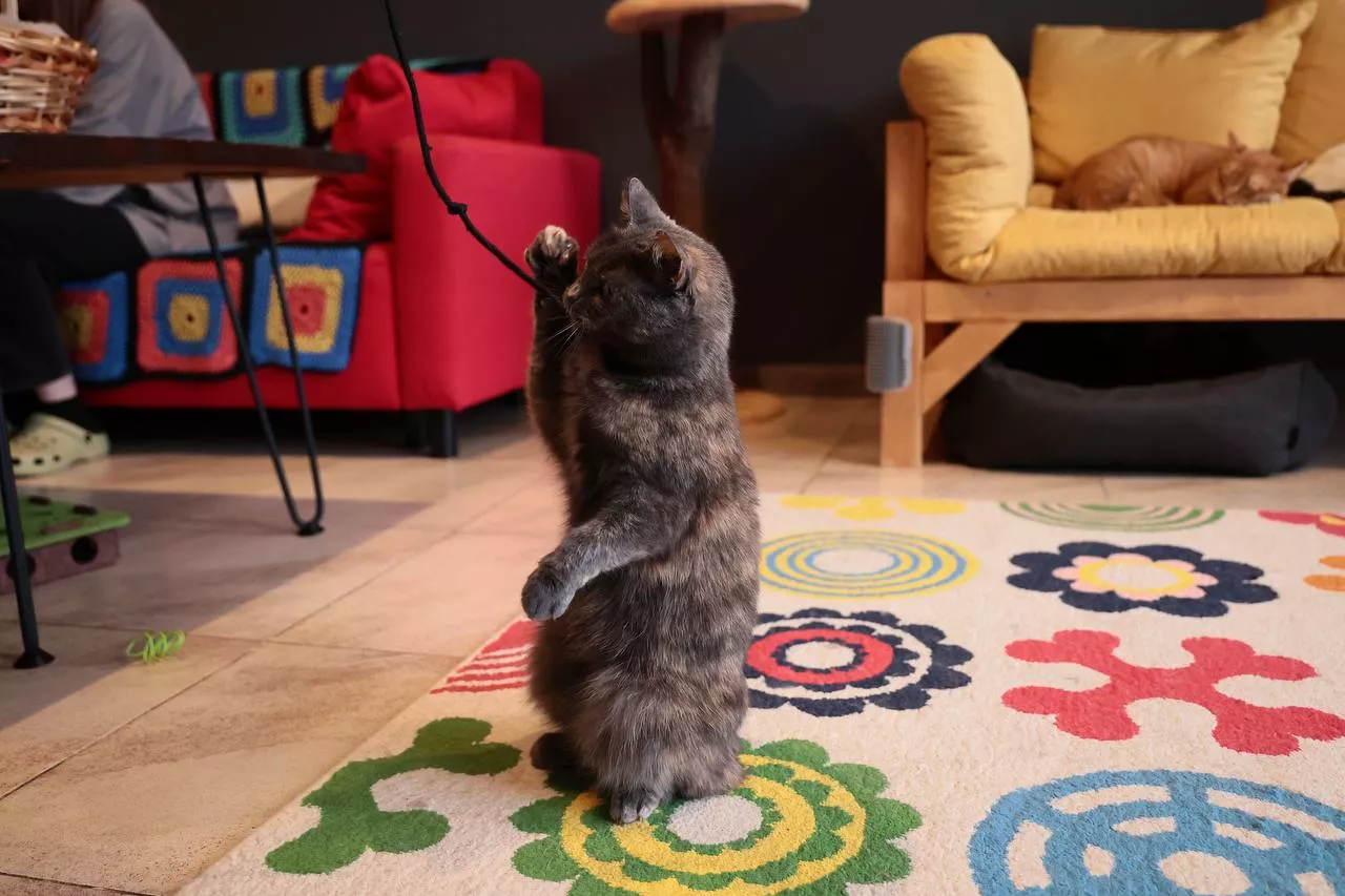 Основное пространство называется котейная. Это комната, похожая на большую игровую в детском саду, где в каждом свободном углу — кошачьи «гаджеты»: лежанки и домики, разноцветные удочки, мышки и шуршащие лабиринты, когтеточка в виде дерева и даже беговое колесо. Не у каждого домашнего питомца есть такое разнообразие активностей, как здесь.