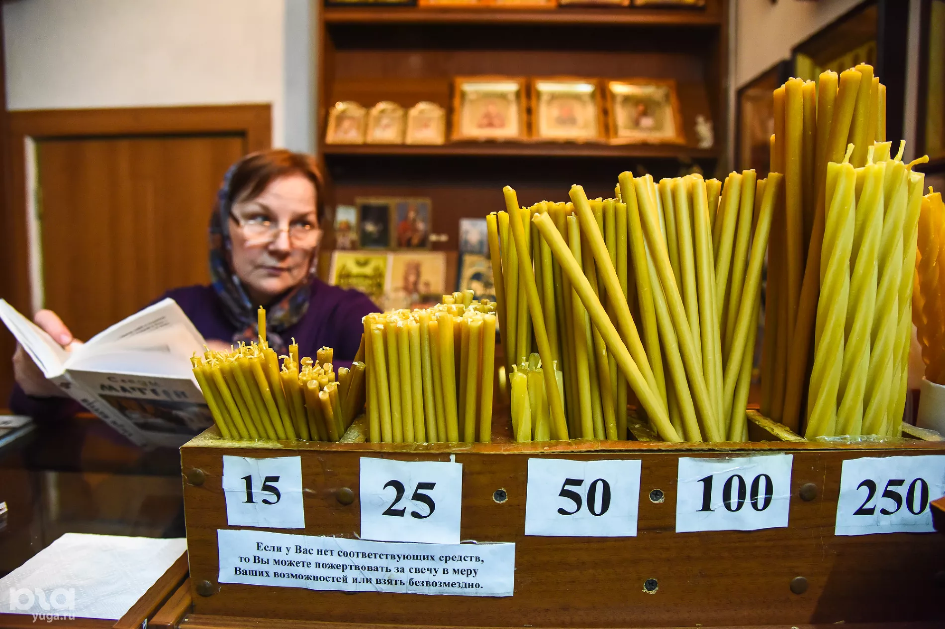В 2014 году прямо на входе прихожанин мог самостоятельно выбрать себе свечу любого размера. Сейчас все свечи одинаково маленькие. Предлагаемый прихожанам размер пожертвования — 8 рублей, вносить его надо в специальную прорезь. Сколько на самом деле вы туда внесете, никто не контролирует.