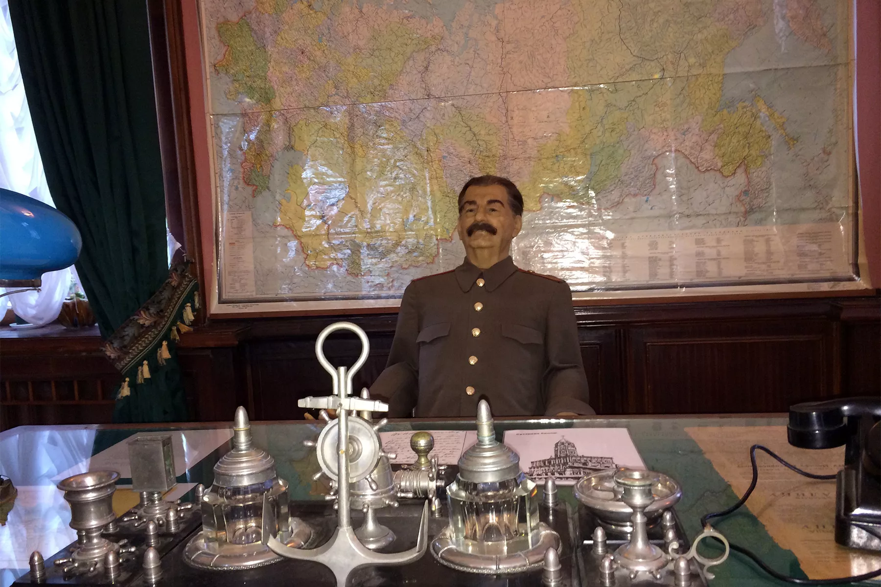 Все внутренне убранство осталось таким же, как и было в середине 20 века. Паркет, стены и потолок выполнены из лучших материалов — их качество проверено временем. Вся мебель и атрибуты погружают посетителей в эпоху 30-х годов. В кабинете туристы могут сфотографироваться с восковой фигурой самого генсека, где он сидит за письменным столом с трубкой в руке.