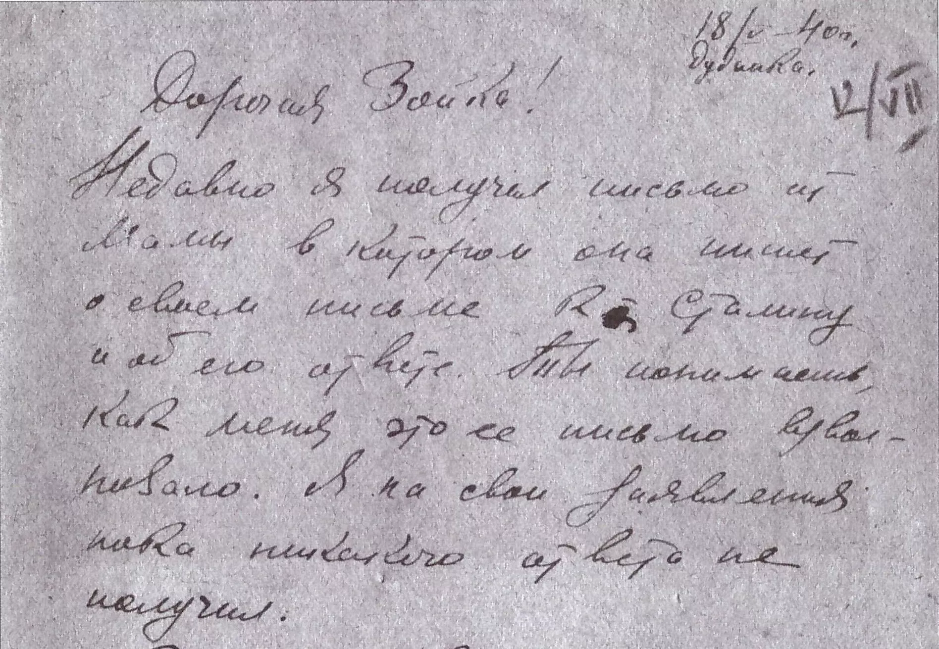 Из письма заключенного В.Б. Зайцева жене Зое Евгеньевне. 18.05.1940 г.