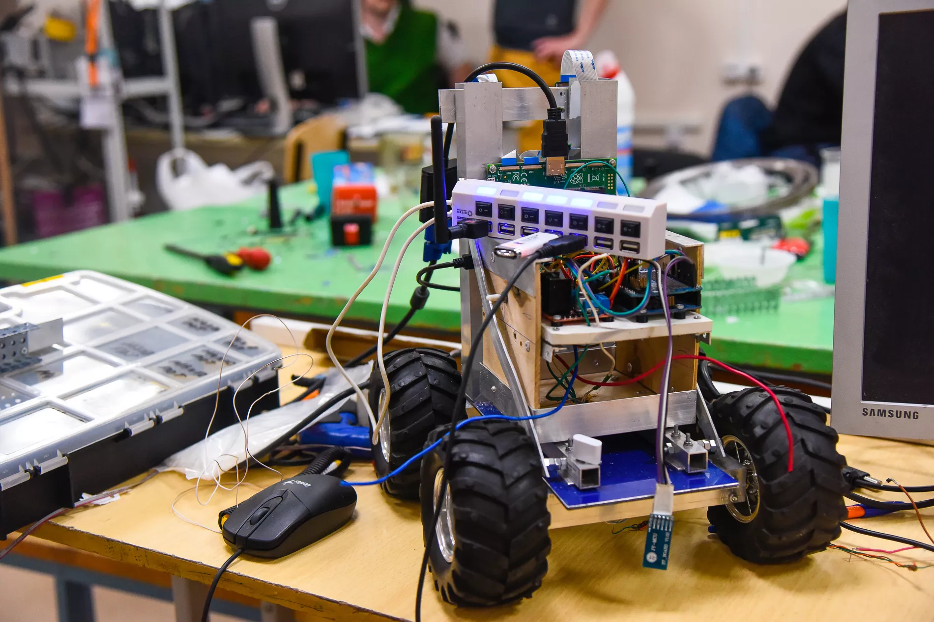 — Наш первый робот был притащен мной из дома и представлял из себя набор микроконтроллеров и моторчиков, собранных на кусках пластика, оставшегося от какого-то рекламного баннера. С этой конструкцией мы поехали на международный фестиваль робототехники «Робофинист» в Санкт-Петербурге и сразу там что-то выиграли. Тогда же мы пригласили коллег из СпбГУ, которые провели для наших студентов недельную школу по робототехнике, где люди смогли почувствовать свою власть над железом, понять, как, благодаря простому набору действий, оно оживает и начинает выполнять какие-то сформулированные заранее задачи. Это дает хорошие ощущения и приносит удовлетворение людям, которые пришли заниматься техническими науками.