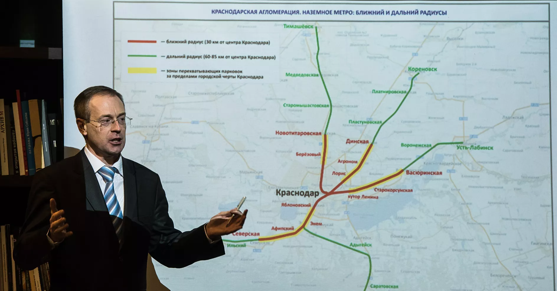 Краснодару повезло: в городе достаточно много железнодорожных линий, которые пересекают его в нескольких направлениях. Первый участок — 30-километровая зона вокруг Краснодара, ограниченная Северской, Новотитаровской, Динской и Васюринской. Это самые напряженные направления для въезда и выезда из Краснодара. Нормальной альтернативы вместо общественного транспорта, который позволяет быстро, надежно и дешево попасть в город, жители пригородов не имеют. Это вынуждает их использовать недешевый личный транспорт. Если создать в этом 30-километровом радиусе наземное метро, которое сможет доставлять людей на работу, у них будет возможность пересесть с личных автомобилей на общественный транспорт.