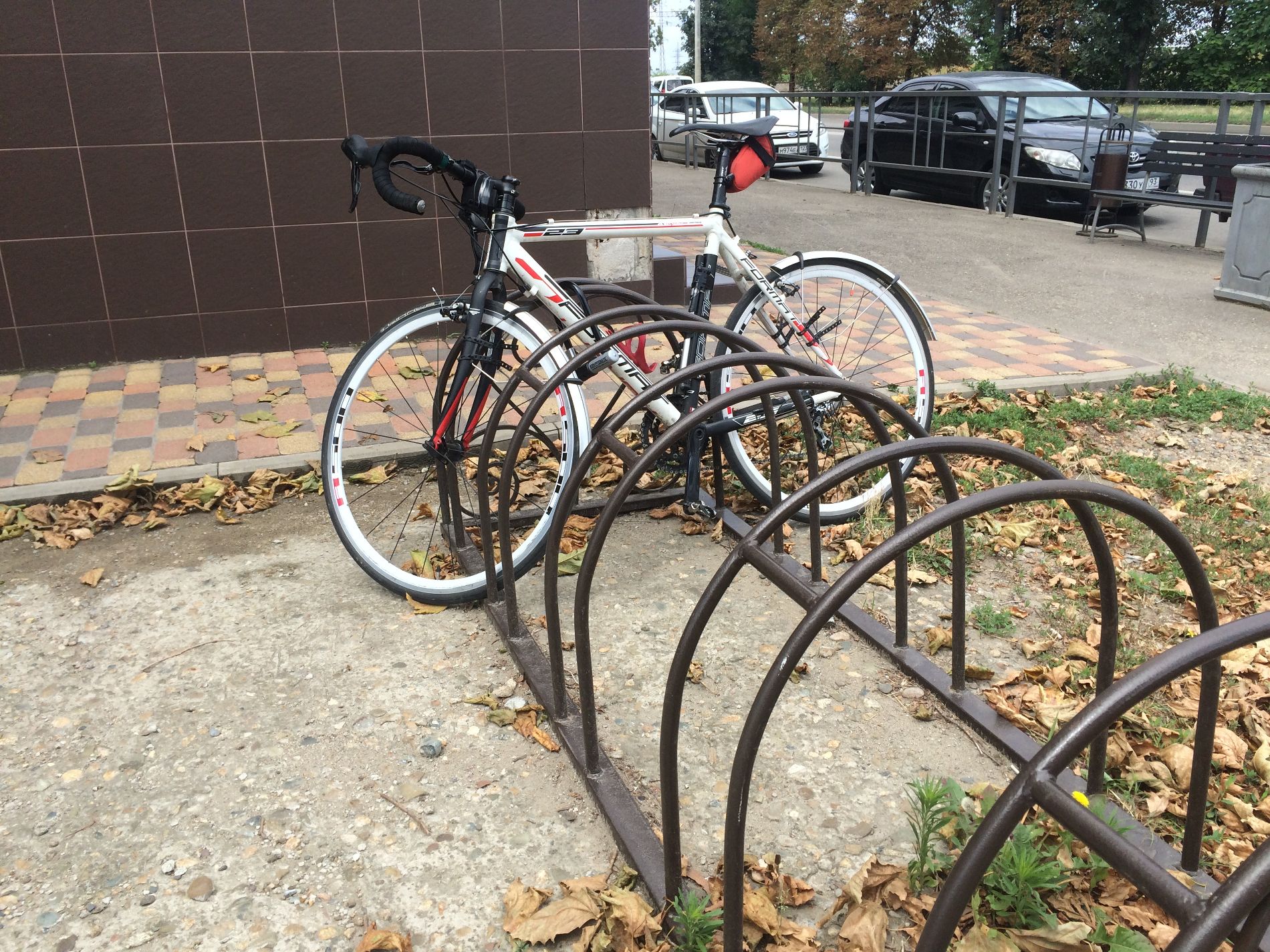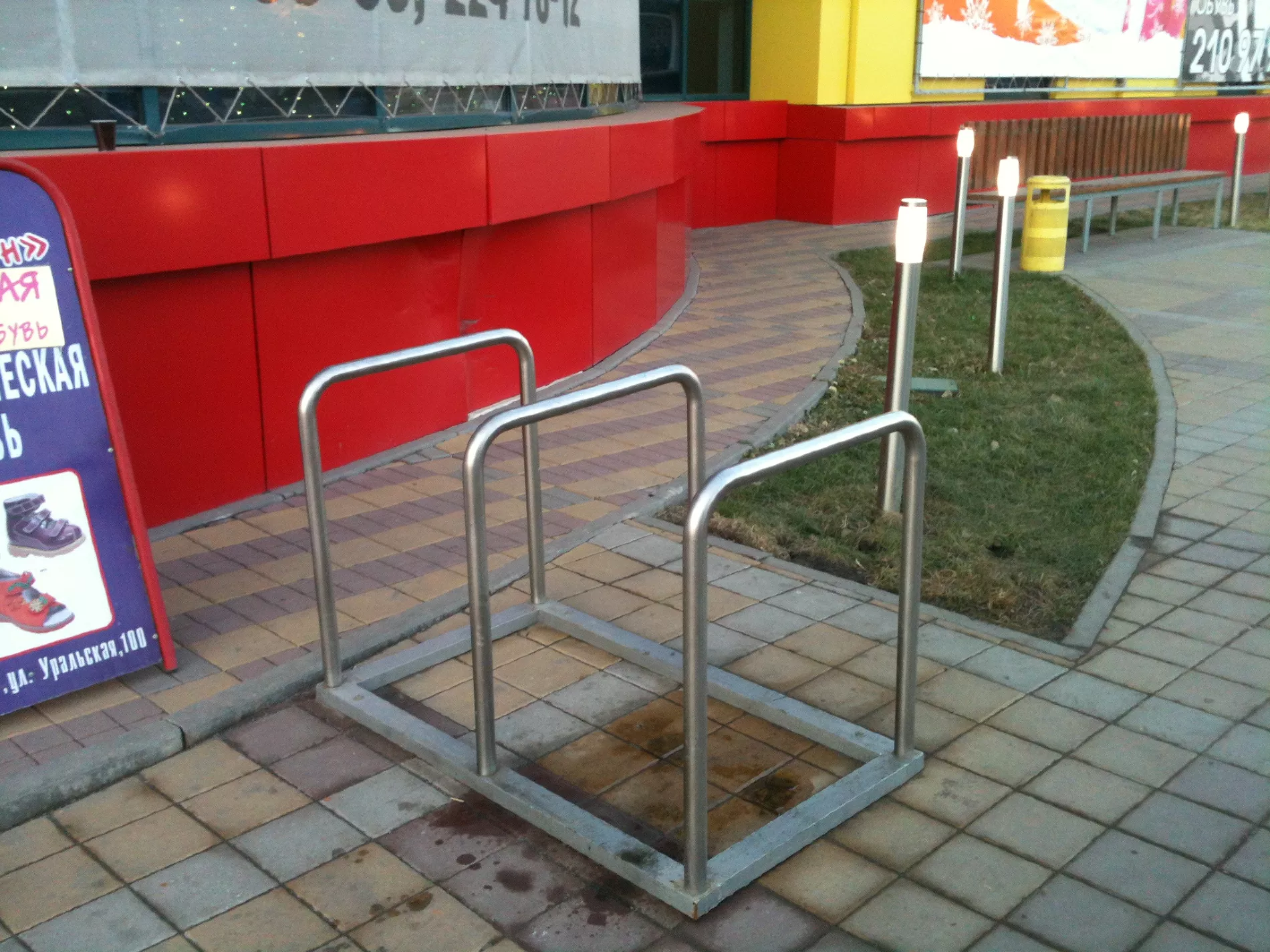 Сразу отвечу на популярный вопрос: как пристегивать велосипед к такой парковке? Очень просто — за заднее перо. Ставим велосипед задним колесом в парковку и пристегиваем возле него. Ни в коем случае не пристегивайте само колесо — оно очень легко вынимается из велосипеда.