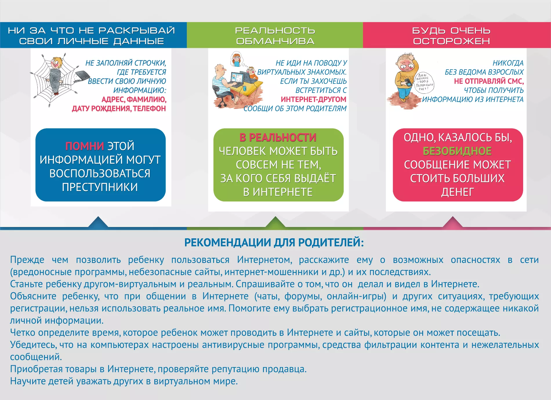 — Мы встречаемся не только со школьниками, но и c их родителями и учителями. Потому что только родительская забота сможет оградить детей от различных интернет-угроз. Интернет прочно вошел в нашу жизнь, и в нем обитает немало людей, которые хотят совершить противоправные действия. Мы рассказываем, как от них защититься.