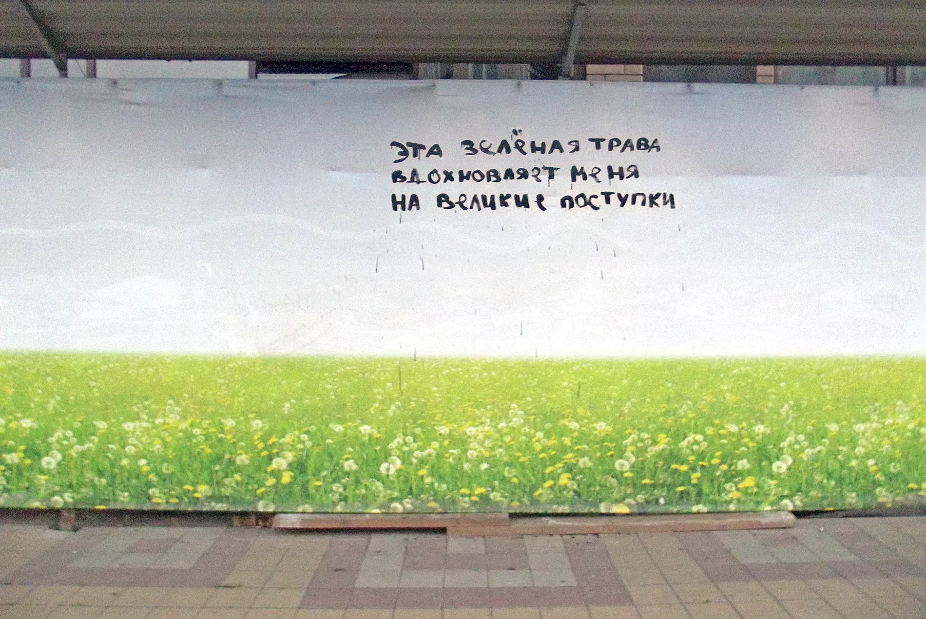 Говоря о «Симуляции благополучия», хочу отдельно упомянуть арт-объект, созданный нашими властями, — симулякр дома в натуральную величину на Северной-Садовой. Я больше нигде такого не видел. Там рухнул дом, обычный одноэтажный такой дом. Видимо, из-за бюрократических проволочек снести это все не удалось, и власти решили прикрыть как-нибудь. Цветочки, наверное, не подошли по высоте, потому что забор там ниже, чем высота дома. И они решили вставить целый дом, не строя его. Достали где-то фотографию типичного деревенского домика — это прям такое стоковое изображение, — распечатали в натуральную величину, потом надстроили над забором специальный «подрамник» под баннер и натянули его. Причем фото действительно в неплохом качестве, если ехать мимо на транспорте, то можно реально его принять за настоящий дом.