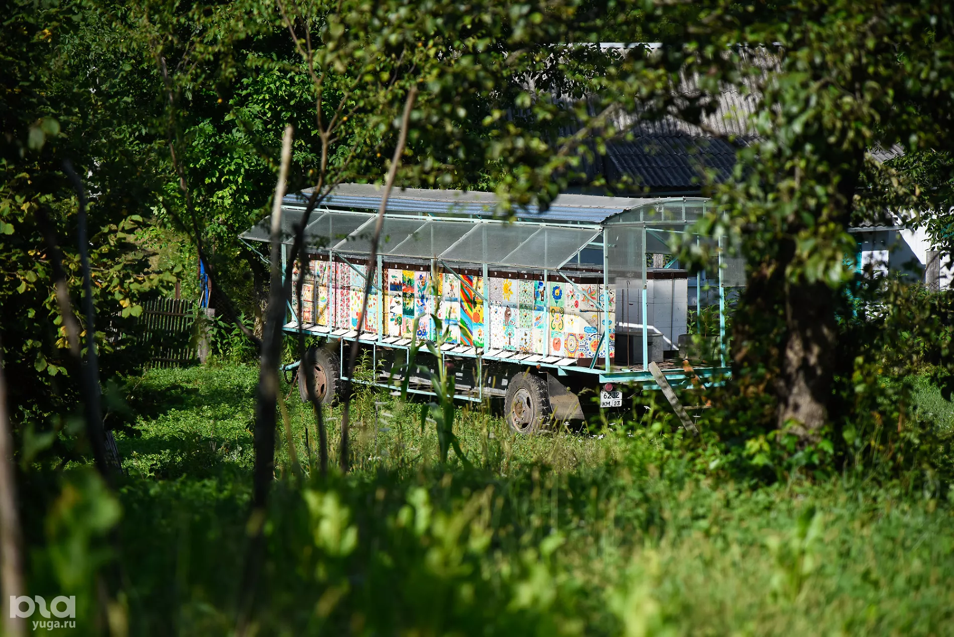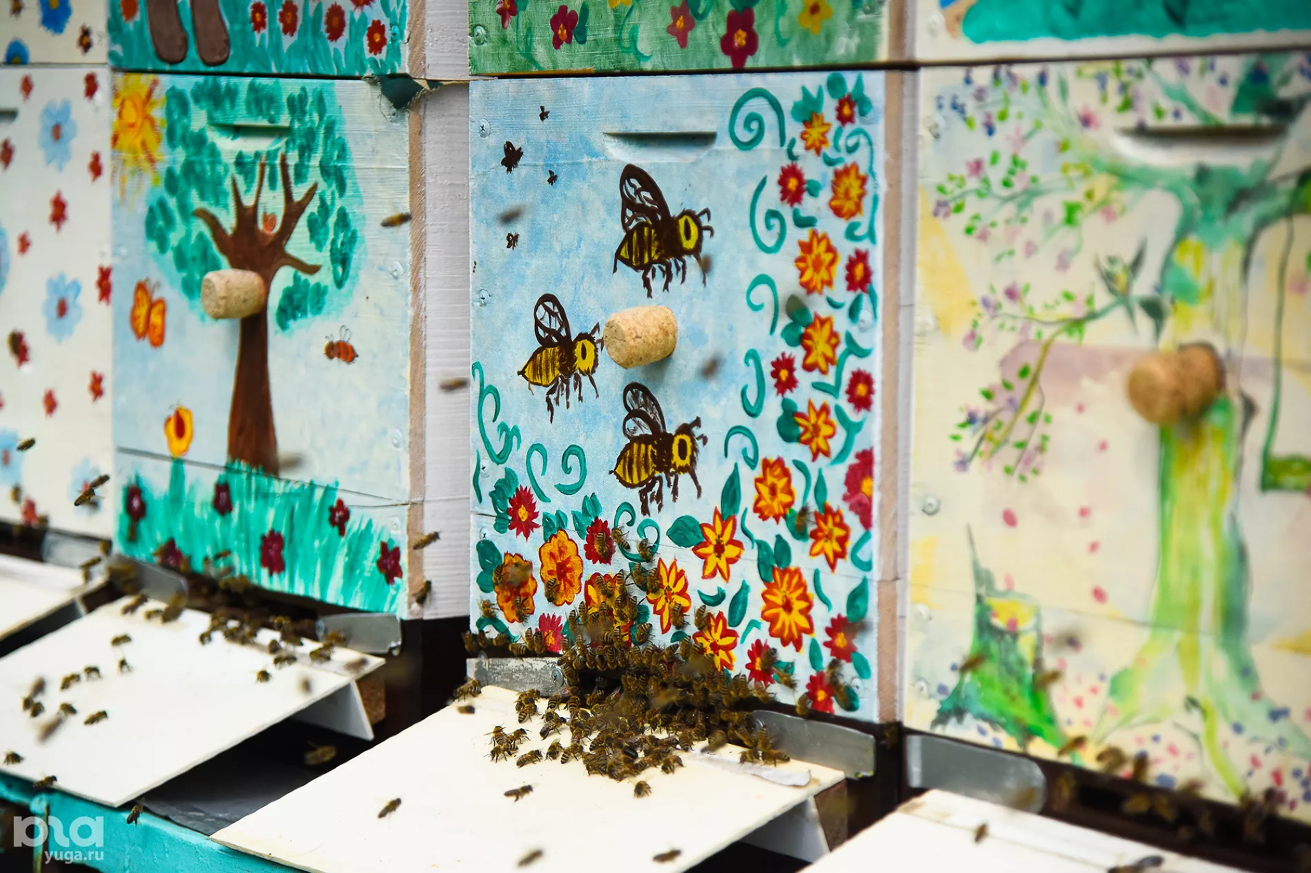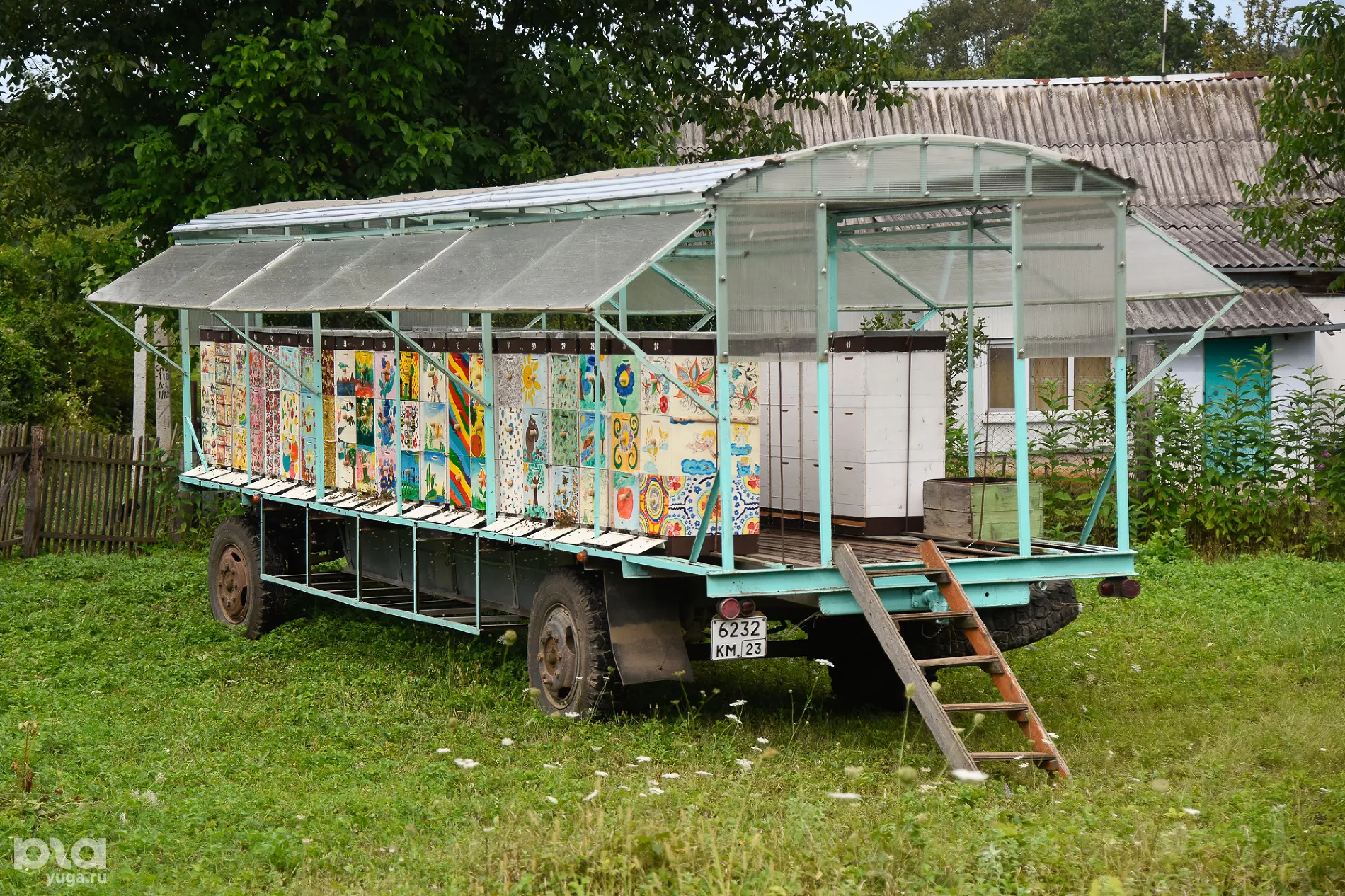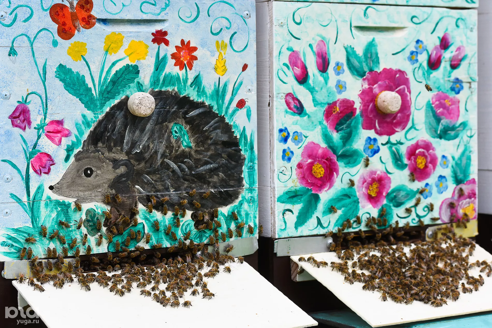 Семья живет в небольшом фургоне: кровать, стол, пару крючков для одежды и здесь же медогонка — большой металлический чан, в котором извлекается мед из сот. Чуть поодаль на участке стоит кочевая пасека. Семья переезжает с места на место, чтобы пчелы могли собирать пыльцу и нектар в разных районах края. Сорок ульев установлены на прицепе, каждый расписан вручную — Викторией и соседями по Новой Поляне. Младшему художнику было шесть месяцев, старшему — 60 лет.
