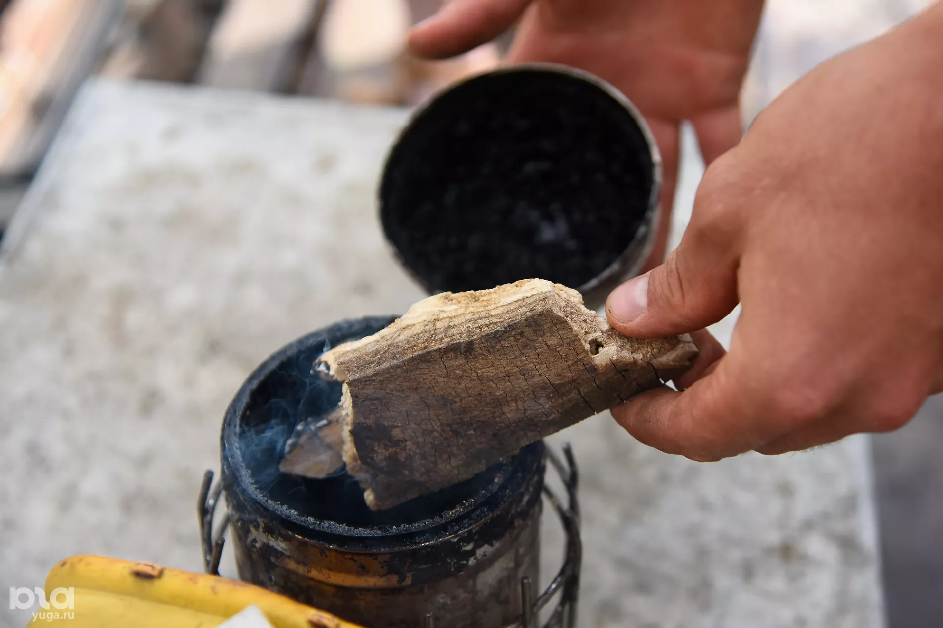 Обычно я не надеваю сетчатую маску и защиту на руки. Открыв улей, буквально чуть-чуть направляю на пчелок дым, чтобы спугнуть с рамок. Смотрите, я спокойно с ними работаю, они даже не думают меня укусить. Это потому, что я хорошо изучил своих пчел и знаю, когда можно забрать мед, а когда лучше не подходить к ульям. Раньше с пчелами обращались варварски: вырезали дупло, выкуривали их дымом и рушили весь улей. Сейчас многие пчеловоды надевают костюмы и используют едкие препараты, чтобы сгонять пчел с рамок. Но я не понимаю, зачем так насиловать пчел. А еще используют автоматические медогонки, электрические ножи для обрезания сот, заодно включают сразу телевизор и радио. Я все делаю руками — в этом душа и искусство.
