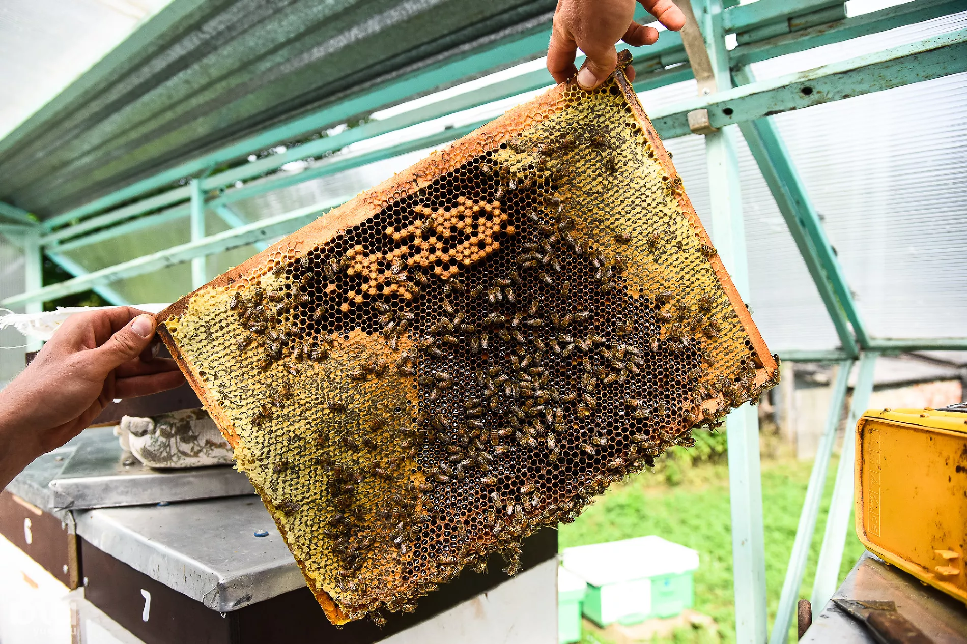 Мы не вмешиваемся в жизнь пчел ежедневно. Основная работа — весной, когда нужно расширять ульи. В сезон я проверяю контрольный улей — если рамки запечатаны, пора собирать мед.
