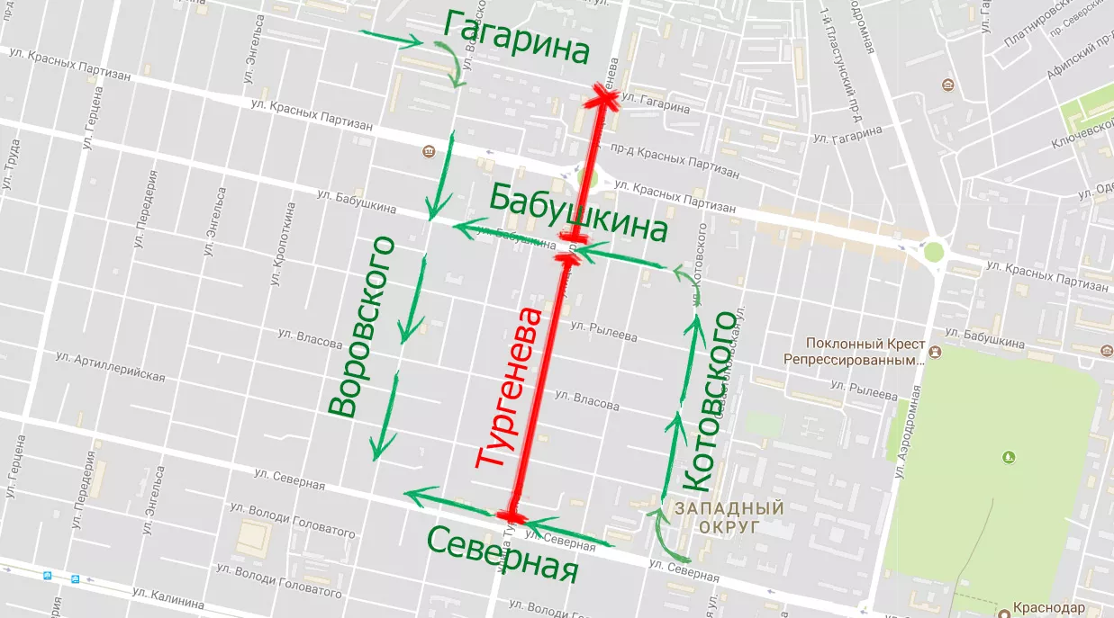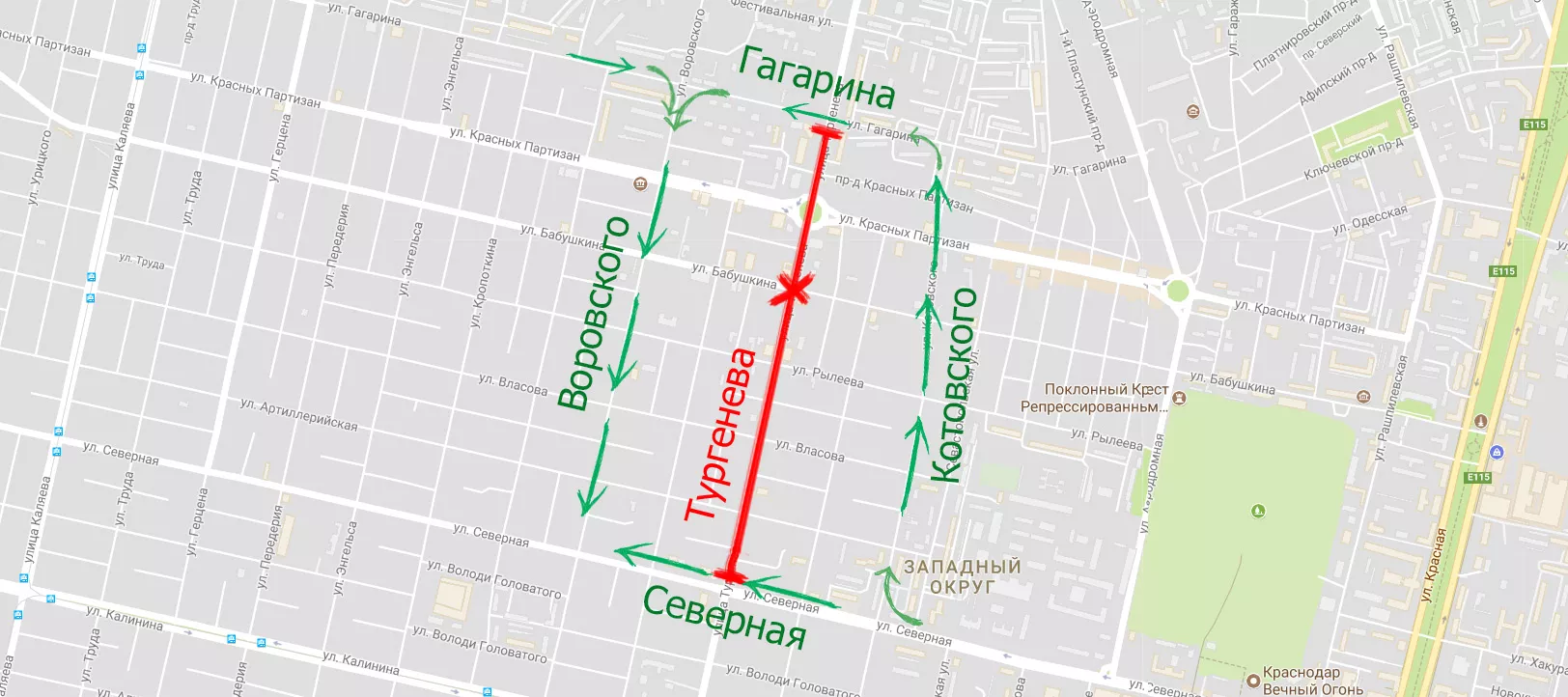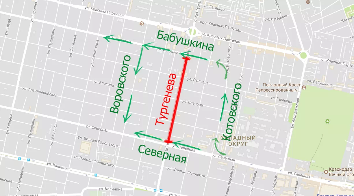 На весь период закрытия Тургенева при движении в направлении центра будет организовано одностороннее движение по Воровского от Гагарина до Головатого. На выезд из центра города в обратном направлении будет организовано одностороннее движение по Котовского от Северной до Гагарина.