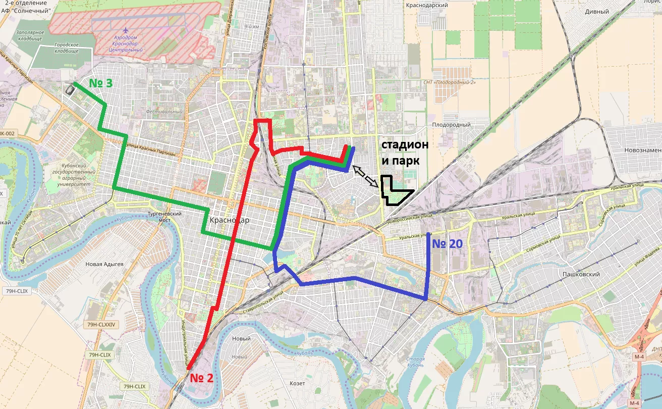 В чем же причина непопулярности трамвая у болельщиков? Всего в 1,5 км от футбольной арены пролегает ветка, по которой идут трамвайные маршруты № 2, 3 и 20. Все они следуют из разных концов Краснодара и проходят через центр города. От остановки «улица Достоевского» до стадиона можно дойти за 20 минут, но народ почему-то не ходит.