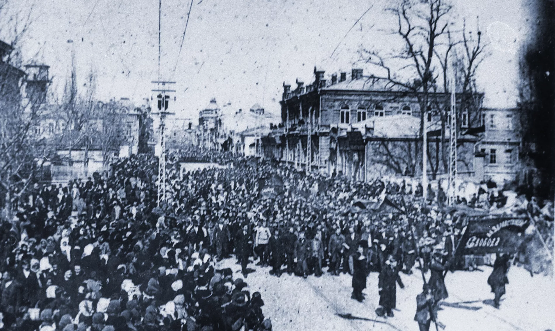 …Одна за другой шли процессии, с красными флагами, толпами, с песнями. Все были радостны и веселы. Екатеринодар был в праздничном настроении. Звонко раздавались звуки «Марсельезы», красные флаги с вышитыми белыми буквами свободы, любви и братства лесом развевались над длинными густыми толпами
