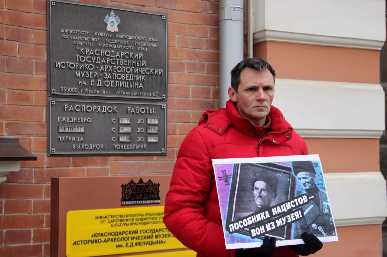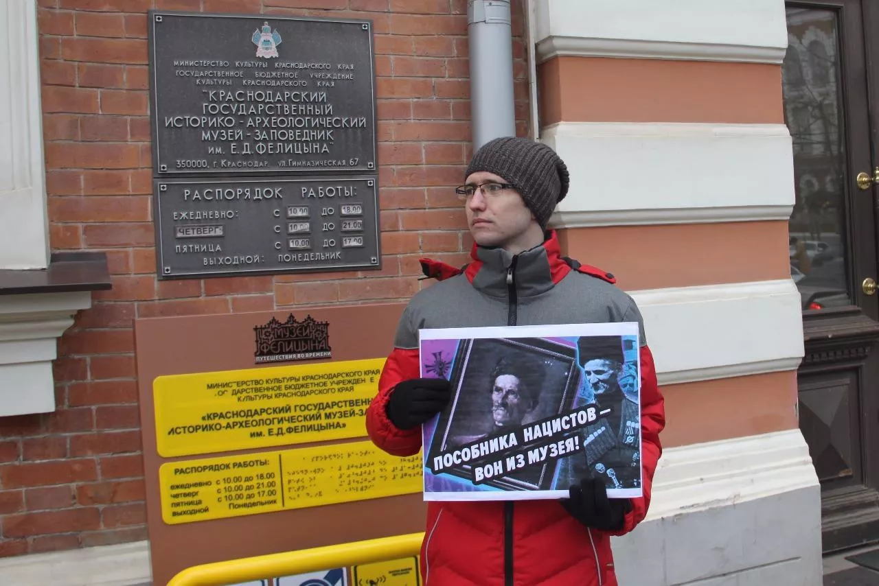В понедельник, 15 января, в Краснодаре два активиста движения сторонников Сергея Кургиняна «Суть времени» пикетировали историко-археологический музей им. Е.Д. Фелицына. Активисты выступали против того, что музей передал Государственному историческому музею в Москве портрет «казака — пособника нацистов» Вячеслава Науменко для выставки об истории Кубанского казачьего войска. Отметим, что по понедельникам музей Фелицына закрыт для посетителей.