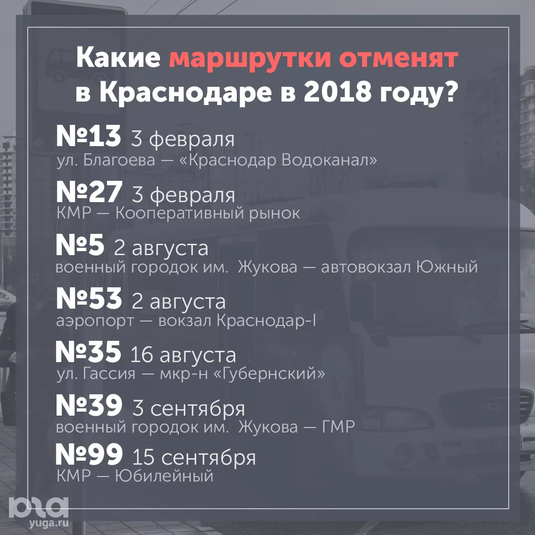 В документе прописывались изменения схем движения муниципальных маршрутов, и, самое главное, здесь же было подробно расписано то, какие маршруты будут отменены. Так, запланировано, что в 2018 году прекратят свое существование семь маршрутов. В феврале перестанут ездить маршрутки № 13 ул. Благоева — «Краснодар Водоканал» и № 27 КМР — Кооперативный рынок. В августе прекратят работать маршруты № 5 военный городок им. Жукова — автовокзал Южный, № 35 ул. Гассия — мкр-н «Губернский» и № 53 аэропорт — вокзал Краснодар-1. А в сентябре уйдут в небытие еще два популярных направления: № 39 военный городок им. Жукова — ГМР и № 99 КМР — Юбилейный.