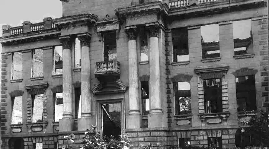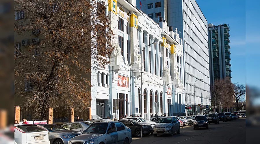 Здание Госбанка сильно пострадало во время войны. Было восстановлено в 1949 году благодаря усилиям инженеров А.А. Алавердина и К.Т. Козьменко.