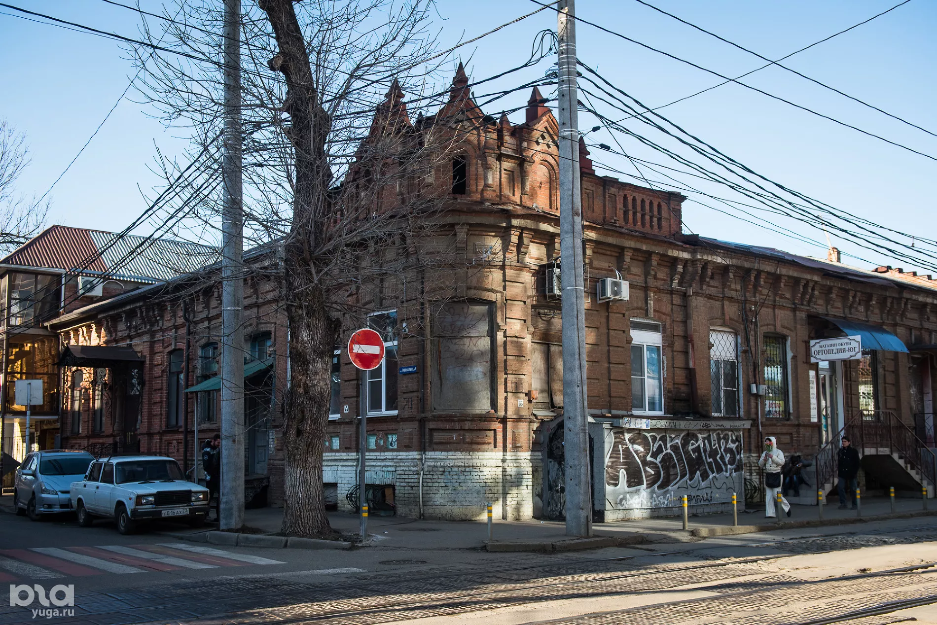 Впрочем, везет не всем, и банки не могут выкупить каждое историческое здание в городе. Через дорогу от бывшей бани Виноградского расположен жилой дом конца XIX века. Владельцы здания, в котором в 1900-е годы действовал марксистский кружок, сейчас бездействуют. А фасадом, который мог украшать открытки с лучшими видами Краснодара, сейчас можно разве что пугать приезжих.