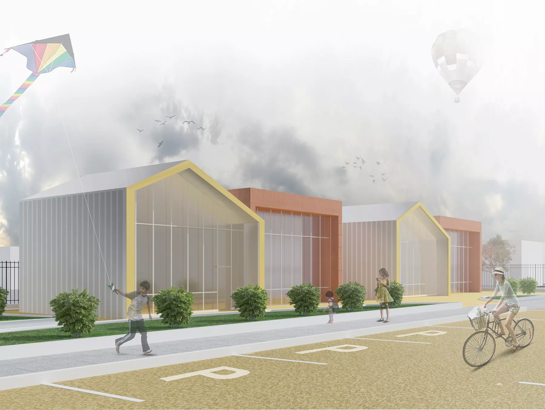 Детский центр, как и предусматривалось техзаданием, у нас получился модульным. Вдохновившись внешним обликом таунхаусов, мы выполнили сами модули в таком же стиле. Модуль прост в своей архитектуре, он гармонично вписывается в сквер и сочетается со зданиями в микрорайоне.
