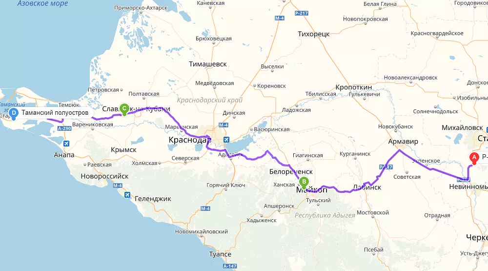 Еще один маршрут, один из самых коротких, — это следовать по трассе М4 «Дон» до 1159-го км шоссе (до станицы Кисляковской), где необходимо съехать на Тимашевск, а далее — на трассу А290, о которой говорилось ранее.