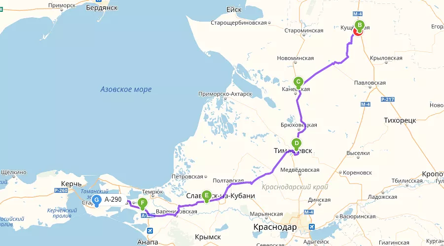 Четвертый маршрут пролегает в объезд Краснодара. Не доезжая краевого центра, надо свернуть на отрезке трассы (на карте это 1278-й км) М4 «Дон» в Кореновске в сторону Тимашевска, где через хутор Белый можно выехать на трассу А290, которая и приведет к Крымскому мосту. Это один из коротких маршрутов.