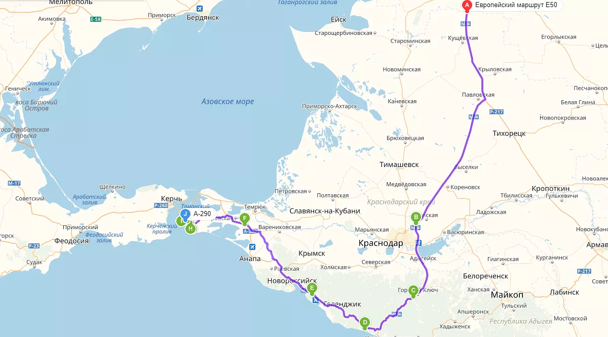 Самый внушительный по протяженности маршрут — дорога по трассе М4 «Дон» в сторону Новороссийска. От города-героя нужно съехать на трассу Новороссийск — Керчь, которая на картах обозначается как А290. Протяженность такого пути составляет порядка 570 км (согласно сервису «Яндекс.Карты»).