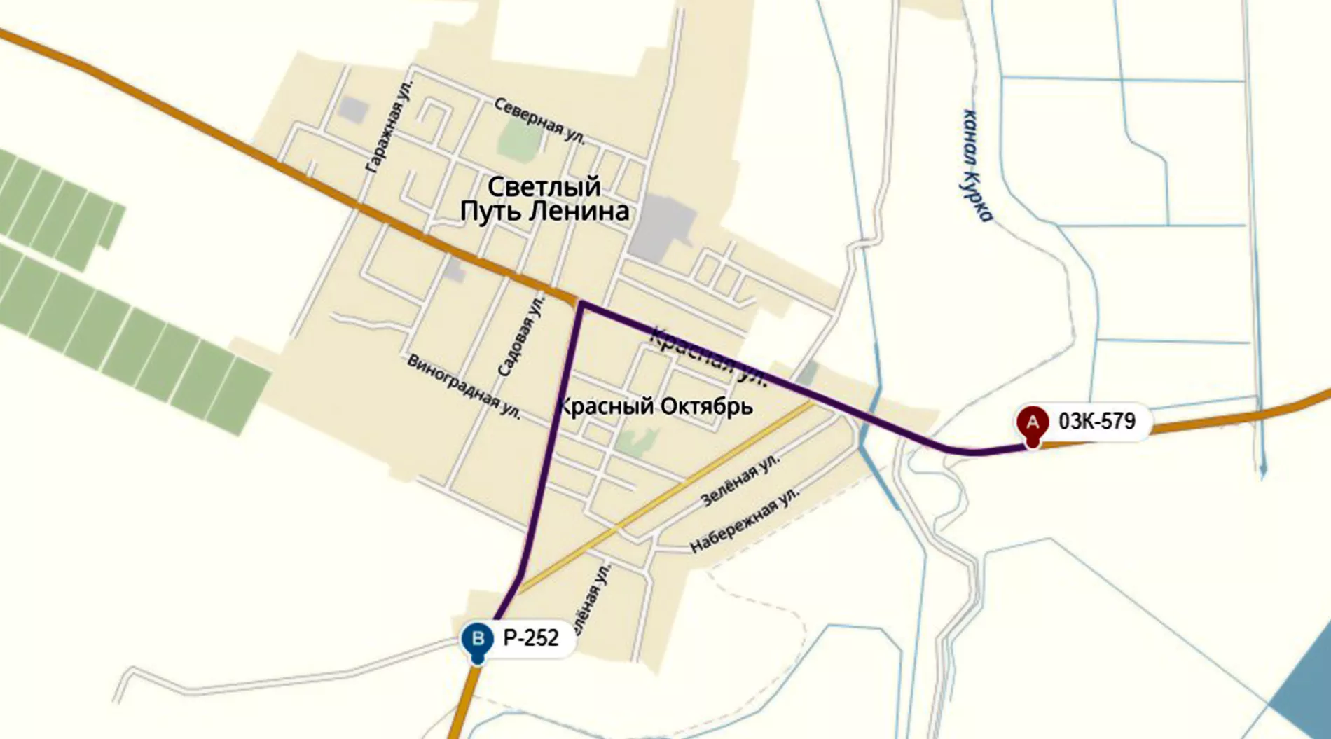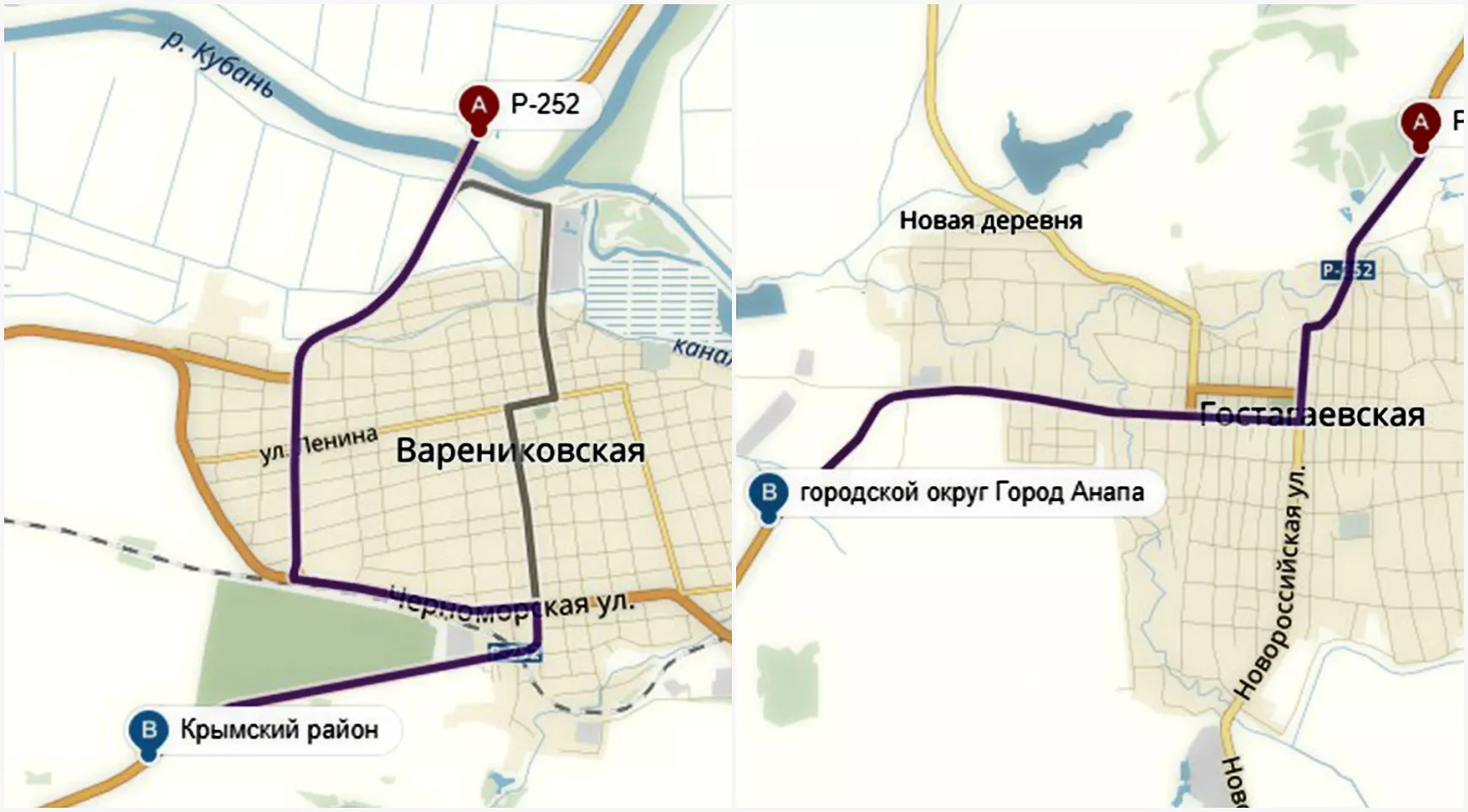 Далее объезжаем справа (по западной стороне) станицу Варениковскую и двигаемся по Черноморской улице до перекрестка с Октябрьской, поворачиваем направо и двигаемся в сторону станицы Гостагаевской через Фадеево.