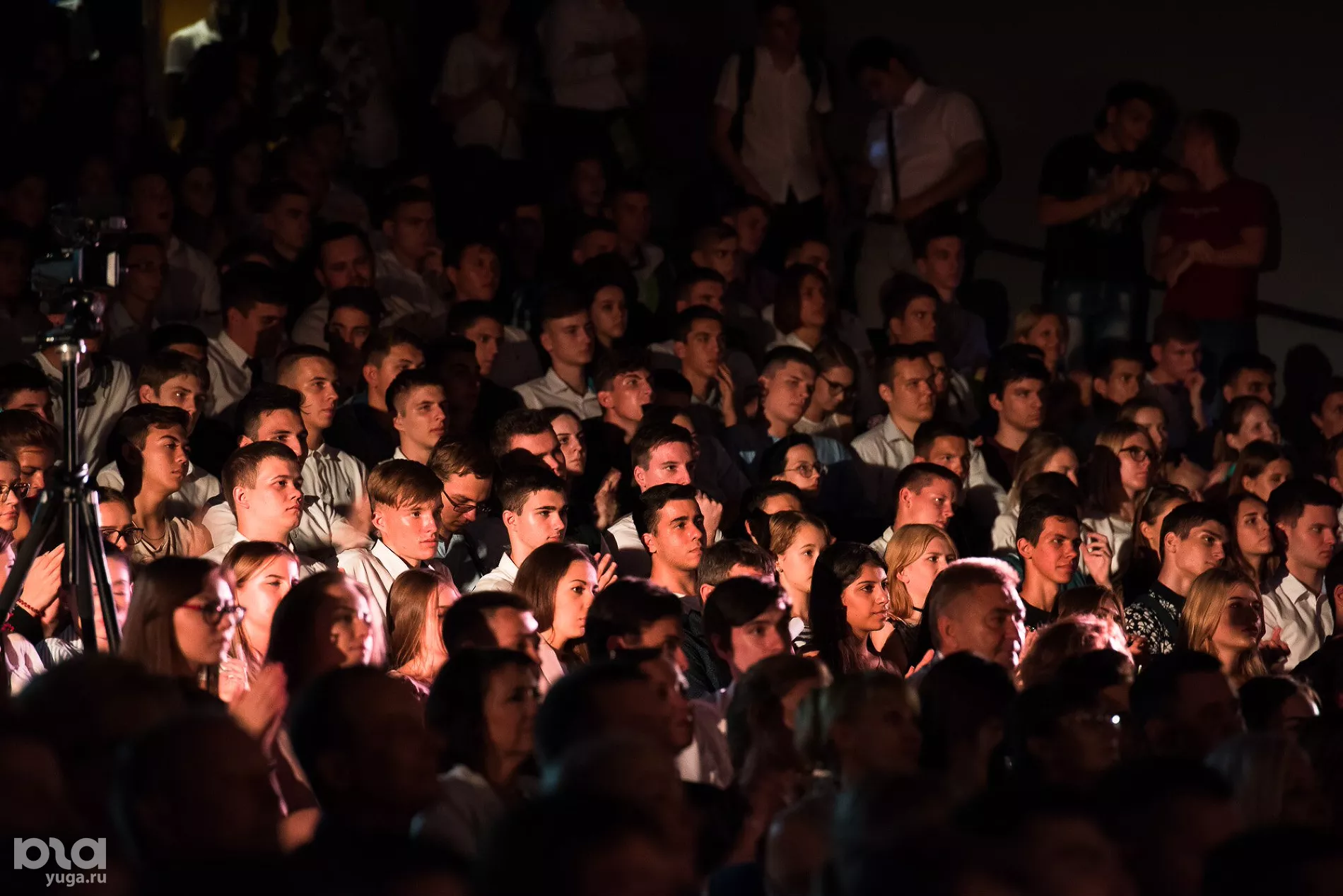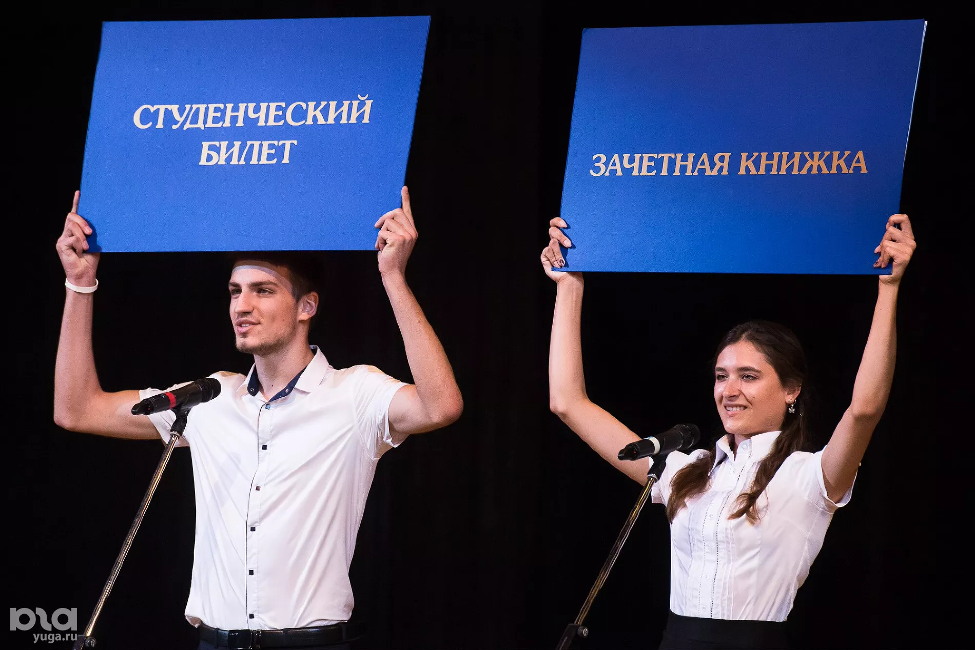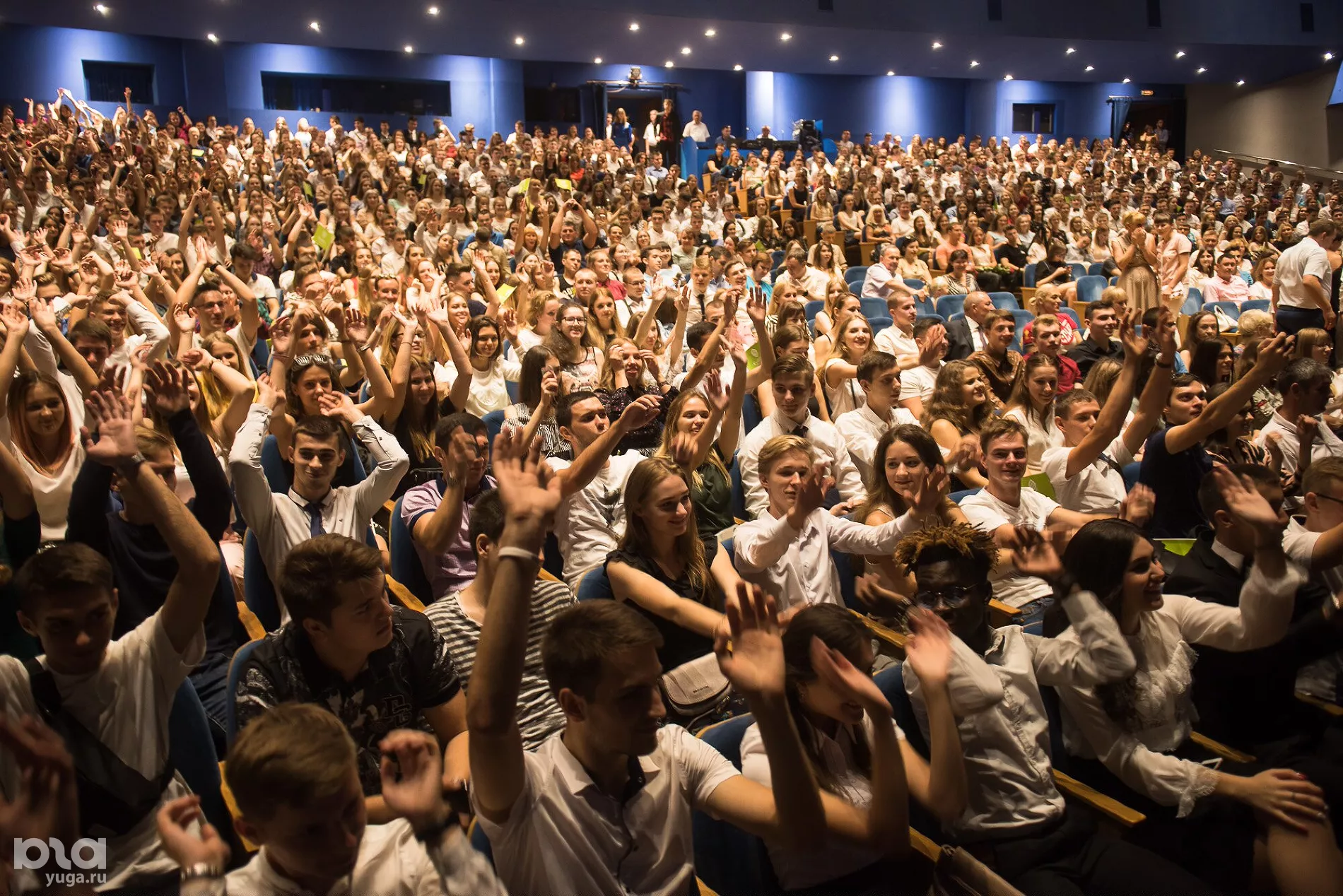 Ко времени, обозначенному в пригласительных, весь театральный зал, включая балконы, был заполнен. Перед началом мероприятия будущие студенты с подачи ведущего начали хлопать в такт мелодии и поднимать «волну», а также выяснили, сколько из присутствующих в зале окончили школу с медалью и откуда приехали в Краснодар учиться.