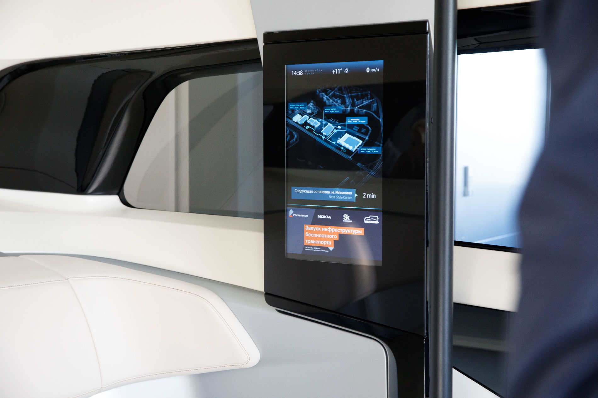 На специальной площадке инновационного центра «Сколково» уже катаются два беспилотных электробуса КамАЗ, разработанных совместно с ФГУП «НАМИ». Сам автомобиль по габаритам больше напоминает маршрутку, рассчитан он на 12 человек. В машине нет ни руля, ни водителя, зато она оборудована внутренними и внешними видеокамерами и различными датчиками. Техническая скорость электробуса — 110 км/ч, но пассажиров он пока катает медленно, заряда хватает на 150 км при полном салоне. Телеметрические данные, данные параметров движения, видеофиксации высокого качества передаются по 5G в режиме реального времени в командный пункт мониторинга.