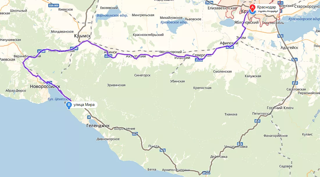 Маршруты занимают от 170 (через Новороссийск) до 200 км. В будний день в отсутствие пробок время в пути составит примерно три часа.