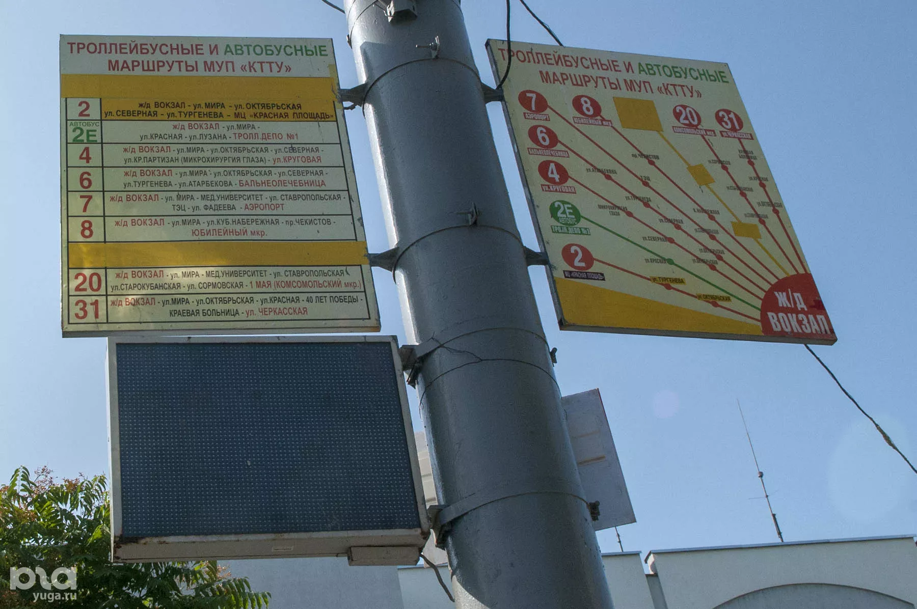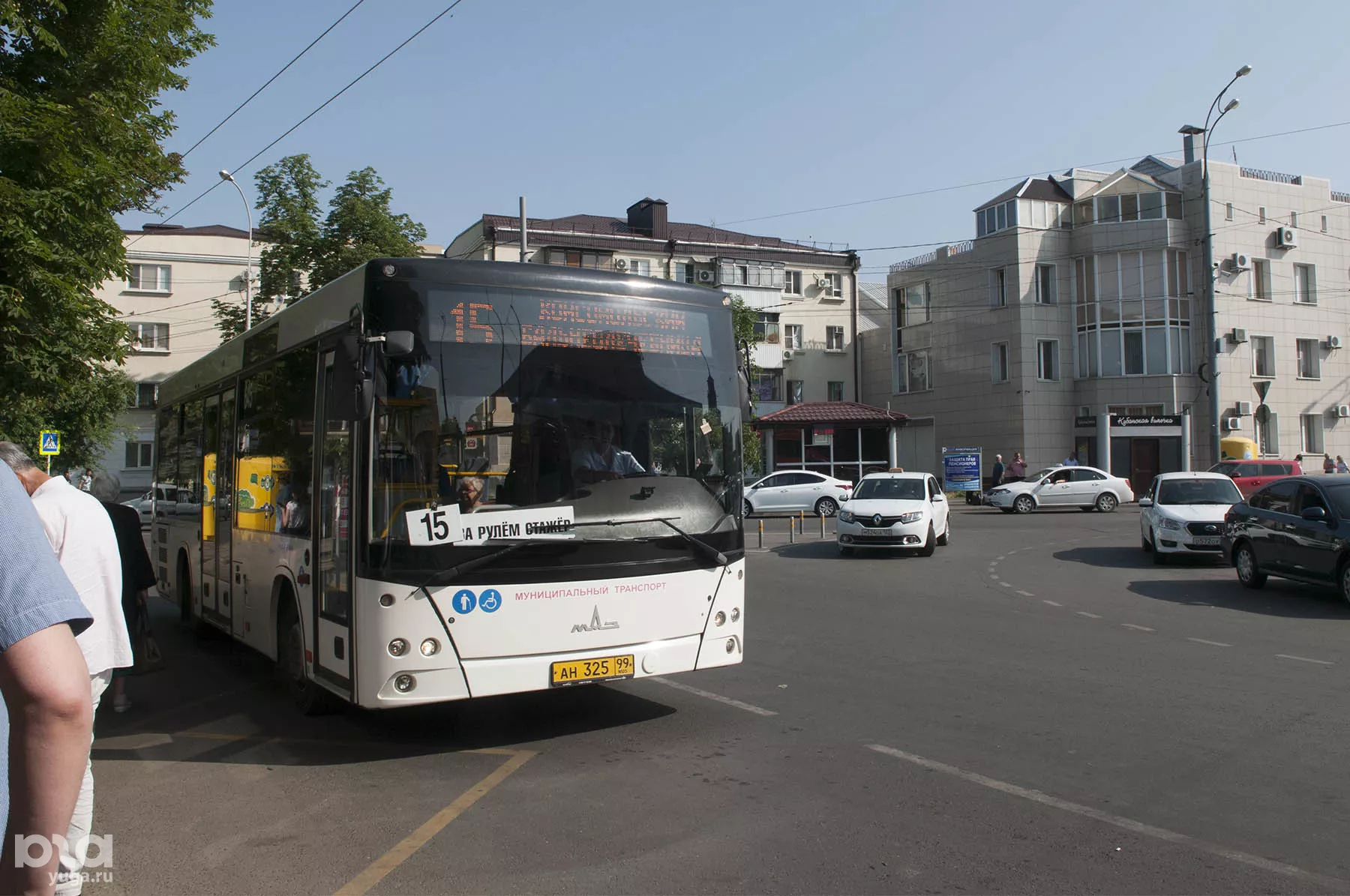 В 8 утра на троллейбусной остановке «Краснодар-1» мы с фотографом и еще человек пять. Кстати, в расписании на табличке, висящей на столбе, 31-й маршрут по-прежнему значится — от ж/д вокзала до ул. Черкасской. Но мы-то знаем, что он больше не приедет, и ждем новый 15-й маршрут. Через пять минут к остановке подъехал белый МАЗ с номером 15 на табло. На экране — надпись «Комсомольский — Бальнеолечебница», красноречиво говорящая, что еще вчера этот автобус выполнял рейс по 14-му маршруту.