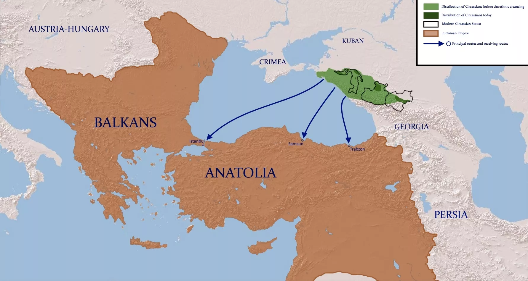 Основным направлением миграции стала Турция. Порт Трабзон располагается в местности, схожей по природным условиям с сочинским Причерноморьем, чем и привлек переселенцев. А единая вера турок (и как минимум шапсугских и убыхских вождей) этот выбор подкрепила.