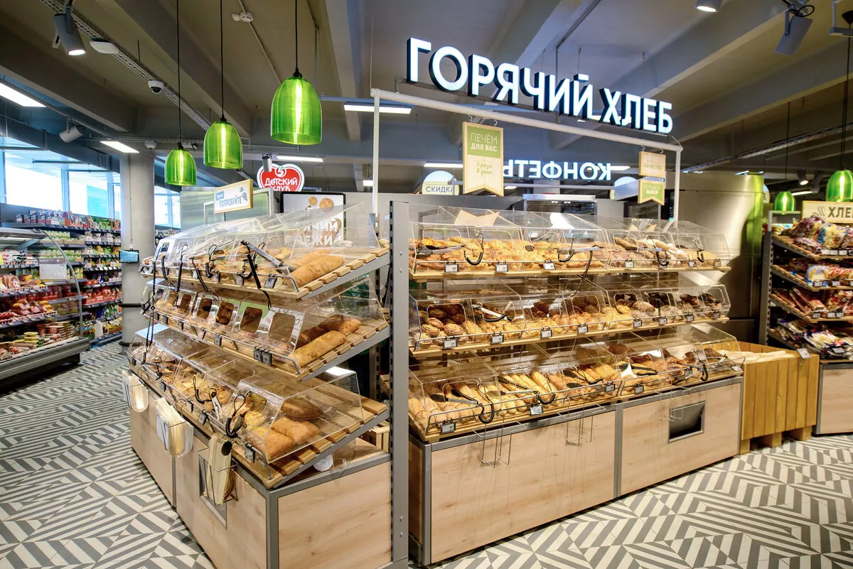 Собственная пекарня. В центре торгового зала появилась пекарня, которая позволила расширить ассортимент выпечки до 40 позиций. Все это хранится в стеллажах со стеклянными перегородками, которые обеспечивают хороший обзор продуктов и сохраняют свежесть, защищая от заветривания.