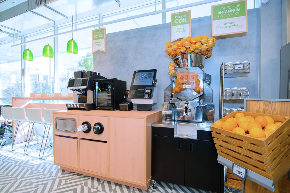 Готовый обед или легкий перекус. Больше 80 наименований продуктов food-to-go и ready-to-eat можно найти в зоне готовой продукции. Также в новом магазине оборудована зона с кофе и свежевыжатым апельсиновым соком. Там же покупатели смогут подзарядить свои гаджеты.