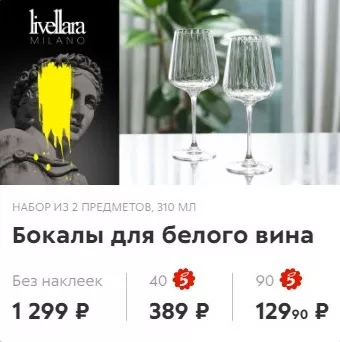 С определенным количеством наклеек бокалы будут доступны с промежуточной или максимальной скидкой: 40 наклеек дают скидку в 70%, а 90 наклеек — скидку в 90%. При желании наборы можно купить и по полной стоимости.
