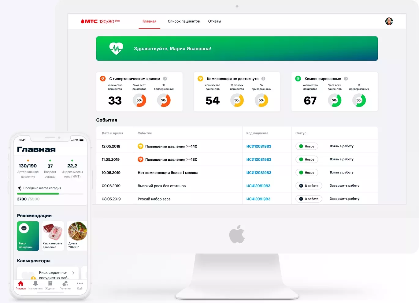 Медицинское учреждение получает доступ для рабочих компьютеров врачей в виртуальный кабинет мониторинга в «Системе МТС 20/80». Врач прикрепляет пациента к программе дистанционного мониторинга, после чего пациент может вносить в бесплатное приложение МТС 120/80 (доступно в Google Play и App Store) результаты замеров артериального давления, пульса, индекса массы тела, принимаемую терапию.