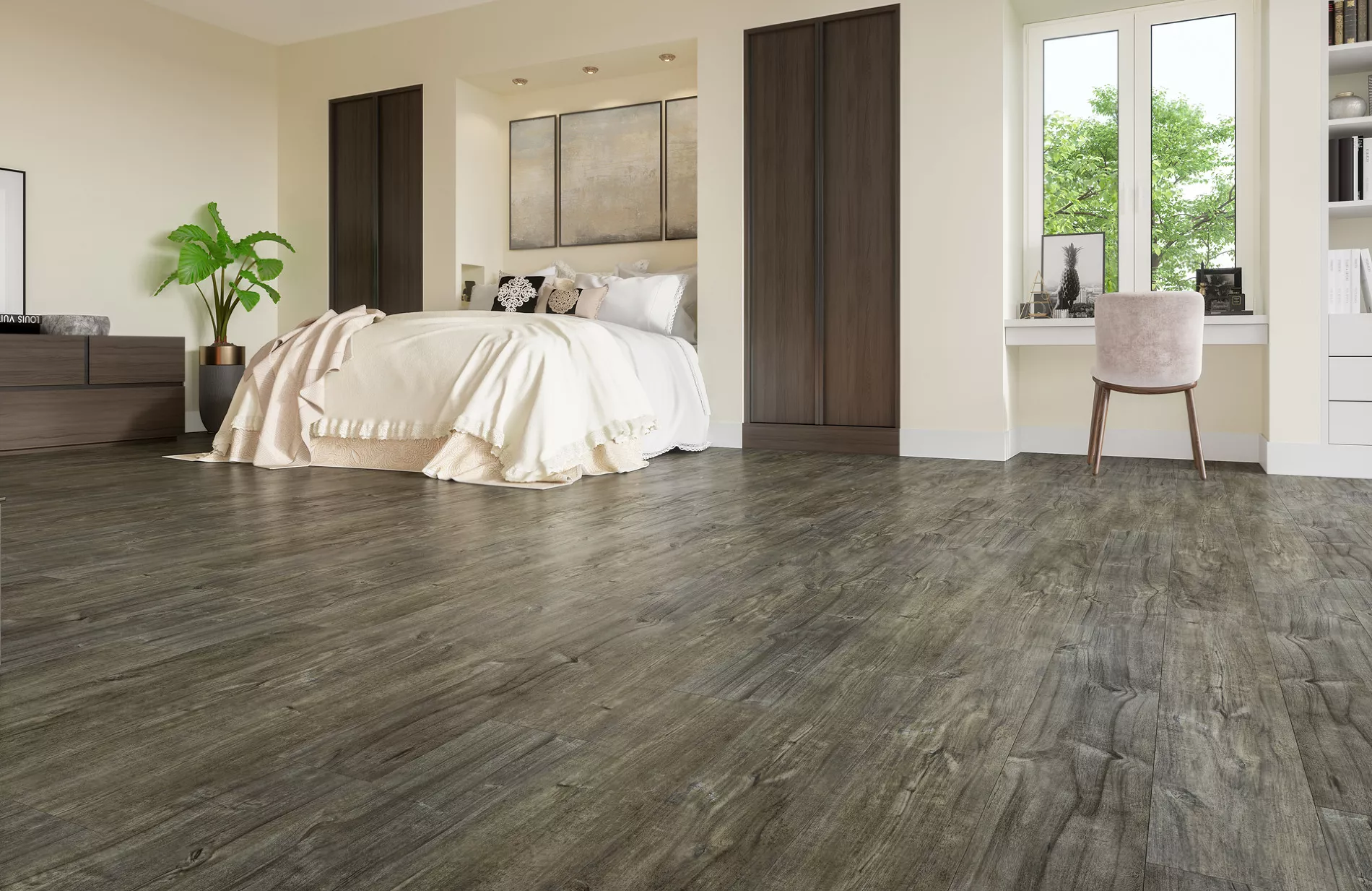 А кварцевый ламинат — это SPC*-плита толщиной в 3,5-4 мм и плотностью около 2100 кг на кубический метр, что вполне сопоставимо с плотностью бетона. Плита покрыта тончайшим декоративным слоем с синхротеснением, которое реалистично передает фактуру дерева или камня. Поверх него — защитный виниловый слой толщиной от 0,3 мм до 0,5 мм. Финальное покрытие — специальный лак, предохраняющий цвет от выгорания.