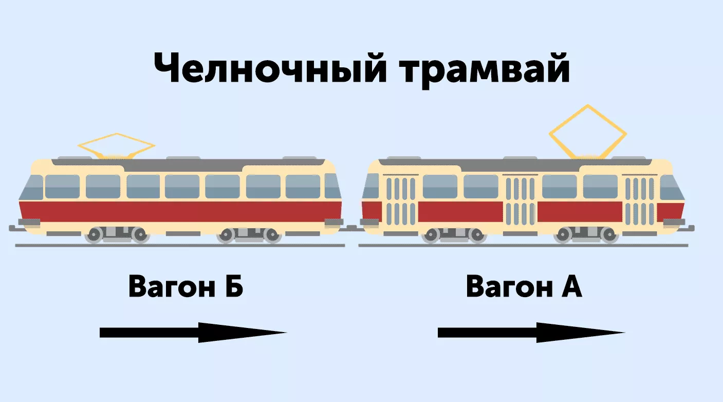 В 7:29 в этом трамвае сменились водители. Происходит это так: водитель А опускает токоприёмник вагона А и выходит на улицу. Водитель Б (он заранее ждал трамвай в челночном кармане) садится в вагон Б и поднимает его токоприемник. Таким образом, вагон А из пассажирского превращается в прицеп (или из ведущего превращается в ведомый), а вагон Б, наоборот, из прицепа превращается в пассажирский. В итоге пассажиров перевозят только в одном вагоне.