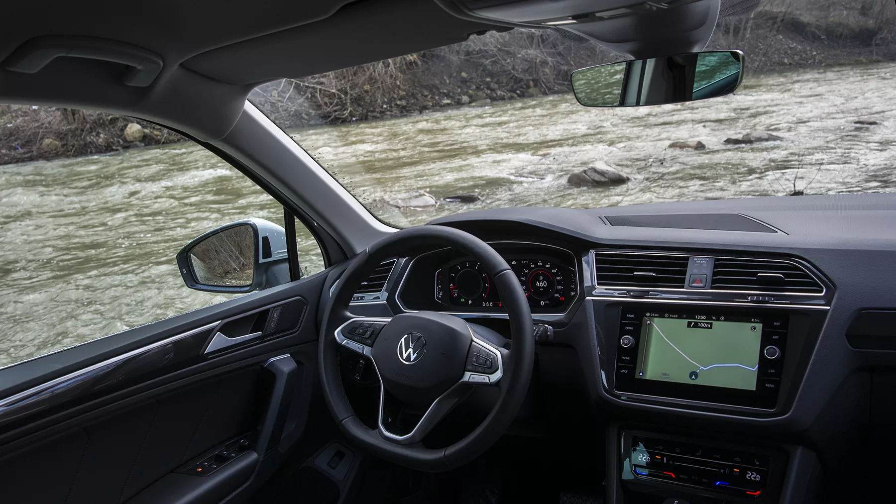 Салон нового Volkswagen Tiguan также далек от слова «обновленный». Он практически полностью изменен. Усаживаемся в кресло с уточненными настройками, внушительной боковой поддержкой, современными материалами отделки — и что видим перед собой? Правильно — новую цифровую панель приборов с интегрированным между тахометром и спидометром качественным навигатором, который помог нам не просто по лесу прокатиться, но даже в русле реки выезд обнаружил без проблем.