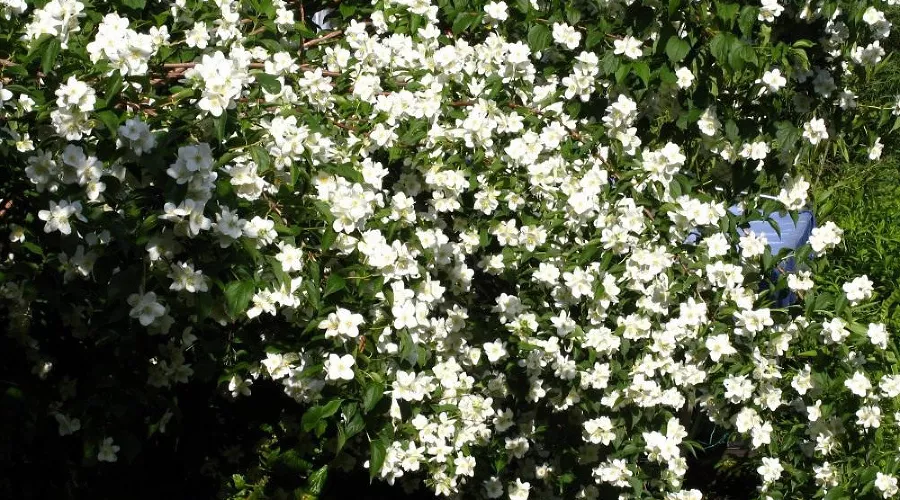 Цветет жасмин белыми, реже — желтыми или розовыми цветками из 4-5 лепестков. В России жасмин часто путают с другим кустарником, который похоже пахнет и выглядит — этот кустарник называется чубушник. Различать их нужно по форме цветков: у жасмина лепестки узкие и выходят из длинной трубочки, тогда как у чубушника цветок крупный и формой напоминает бокал.