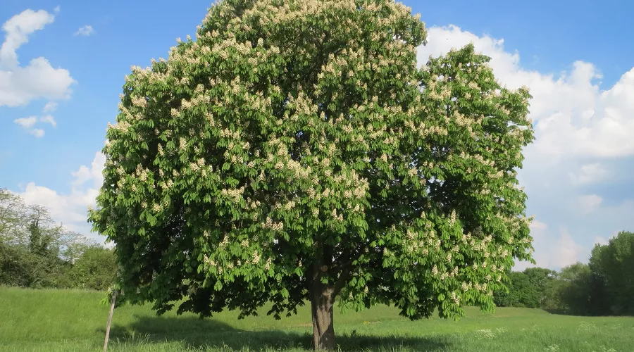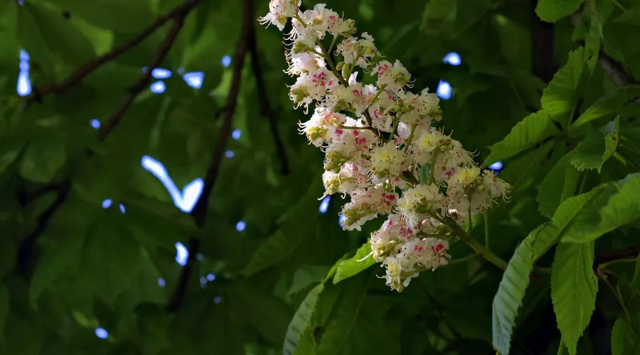 Каштан конский. Также это живописное парковое дерево именуют жёлудником и эскулисом. Впрочем, каштаны в виде кустарника тоже иногда встречаются. Как бы то ни было, растение можно опознать по крупным кистям из 5-7 листьев в форме воздушного змея. И по ароматным цветам, распускающимся прямостоящими конусовидными метелками размером 10-30 см. Расцветают они обычно в мае, вскоре после того, как распустятся листья. Лепестки белые, небольшие пятна на них поначалу имеют желтый цвет, а когда нектар перестает выделяться, становятся красными, давая насекомым понять, что опылять каштан больше нет смысла.
