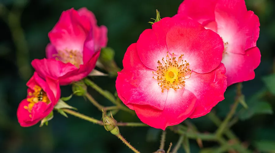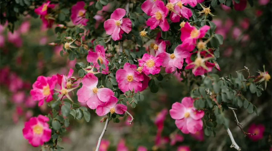 Распускается шиповник обычно в конце мая — начале июня. И цветет ярко-розовыми пятилепестковыми цветками диаметром 3-7 см, которые обычно одиночные, но иногда сгруппированы по два-три. Любуясь этими цветами, будьте аккуратны — побеги кустарника усажены шипами, которые находятся в основании листовых черешков. Гладкие оранжевые или красные плоды шиповника начинают созревать в августе. Их очень любят птицы — рябчики, вороны, галки, овсянки. Возможно, это связано с тем, что плоды шиповника не имеют себе равных по содержанию витамина С: в относительном содержании его тут в десять раз больше, чем, к примеру, в корках апельсина и лимона.