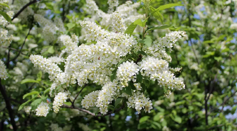 Цветет черемуха белыми, изредка розоватыми цветками, которые собраны в густые поникающие кисти 10-12 см в длину. Обладает очень сильным, приятным и хорошо узнаваемым запахом. Несмотря на то, что цветет черемуха ежегодно, плодоносить ей удается далеко не каждый раз — связано это с тем, что растение очень чувствительно к весенним заморозкам, да и разные вредители черемуху просто обожают.