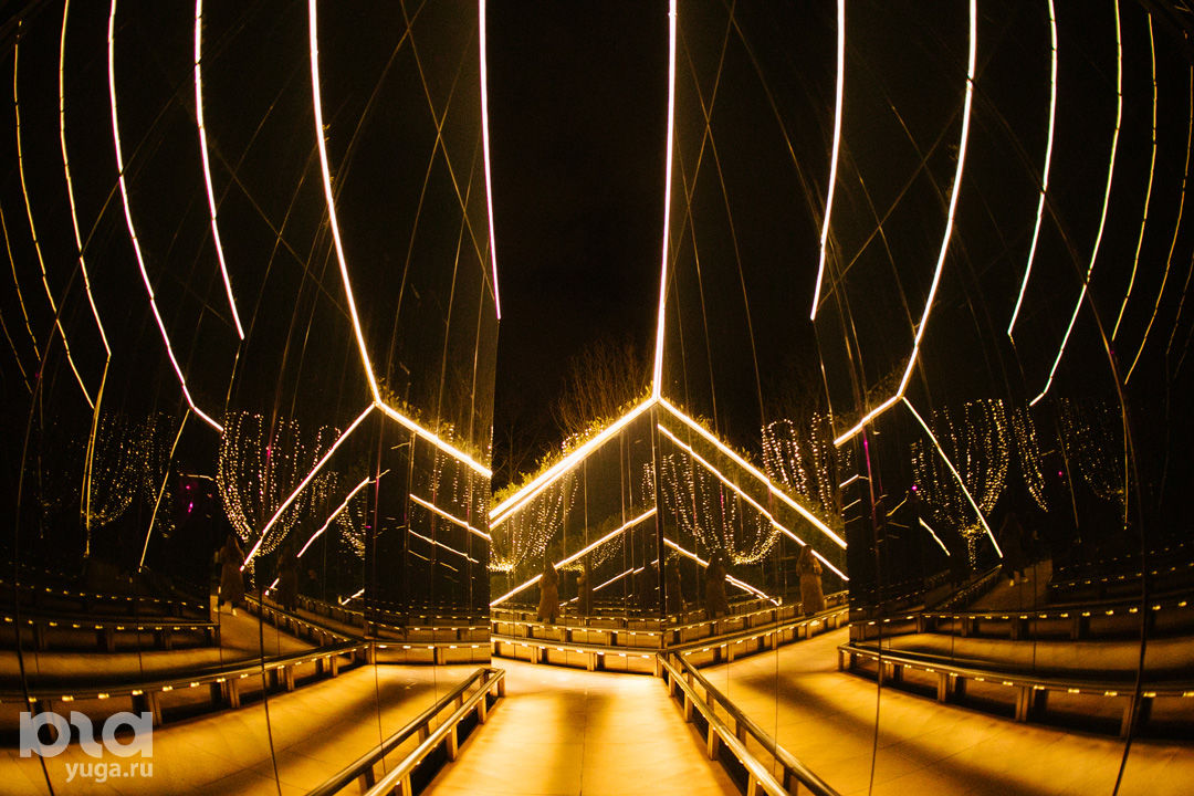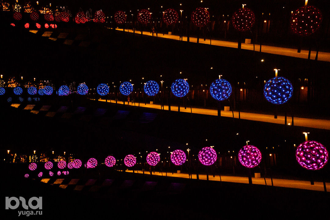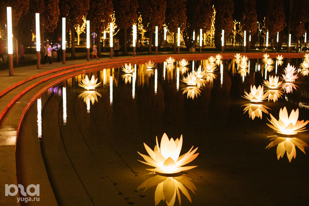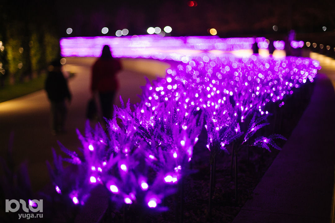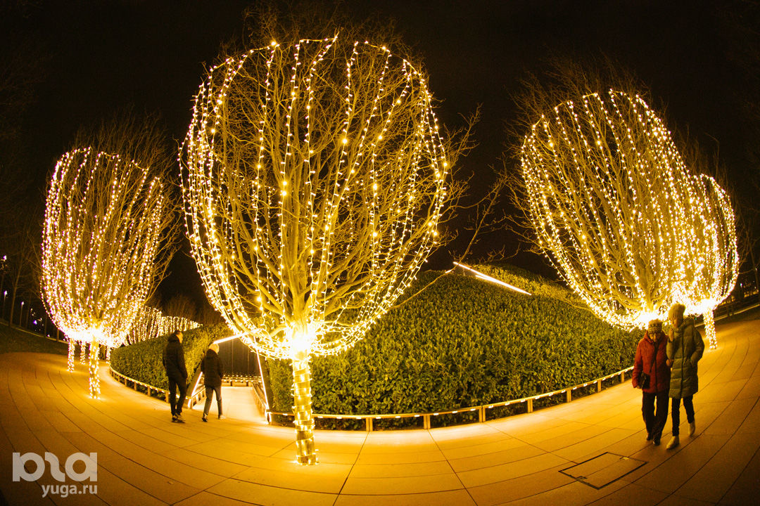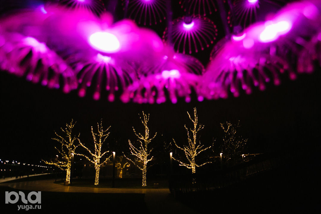 Кажется, во всей этой «декабрьской весне» украшенный парк «Краснодар» — единственное место, где можно почувствовать новогоднюю атмосферу. Иллюминацию включают, как только наступают сумерки.