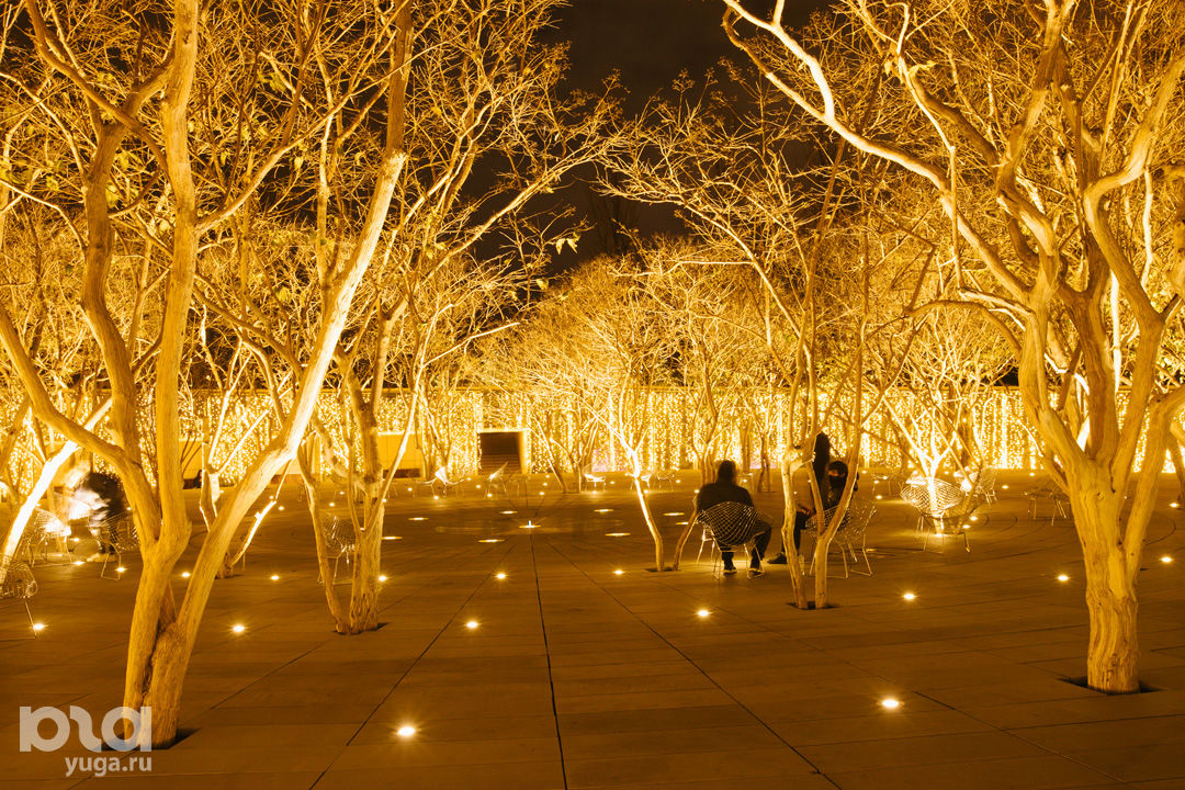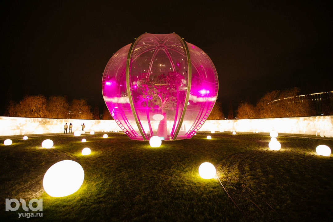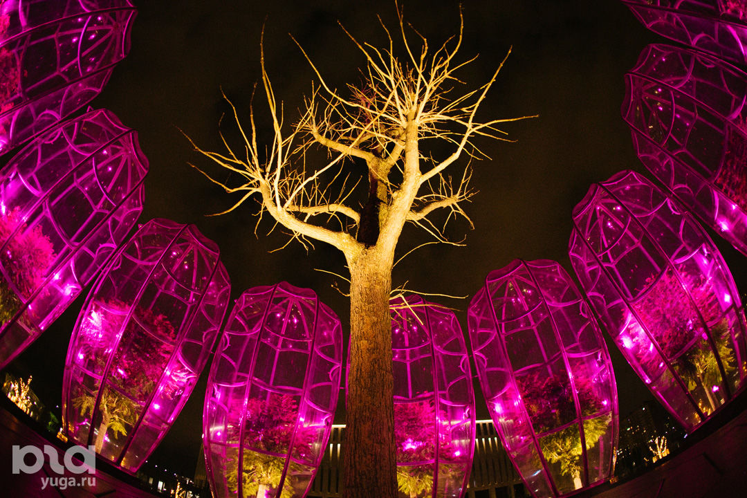 Футуристические «теплицы — коконы» для теплолюбивых деревьев уже давно стали самостоятельными арт-объектами и напоминают космические корабли. На поляне вокруг «укутанного» баобаба разбросали круглые фонари.