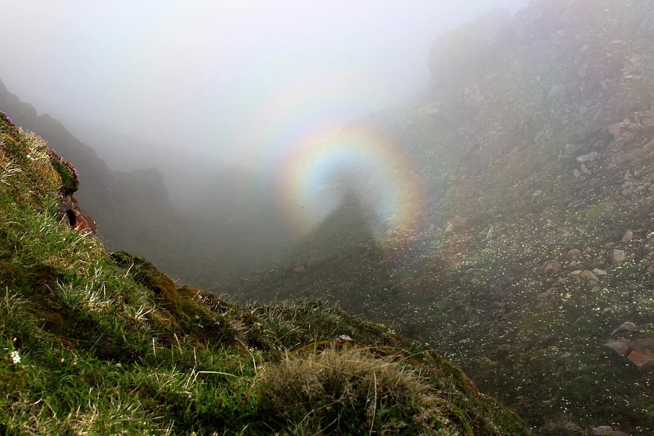 Такие «спецэффекты» в горах могут по меньшей мере удивить или впечатлить зрителя. На самом деле это всего лишь оптическая иллюзия: свет позади наблюдателя проецирует его собственную тень на поверхность облаков или тумана. Сияние вокруг — глория — результат преломления света, проникающего сквозь капли воды.