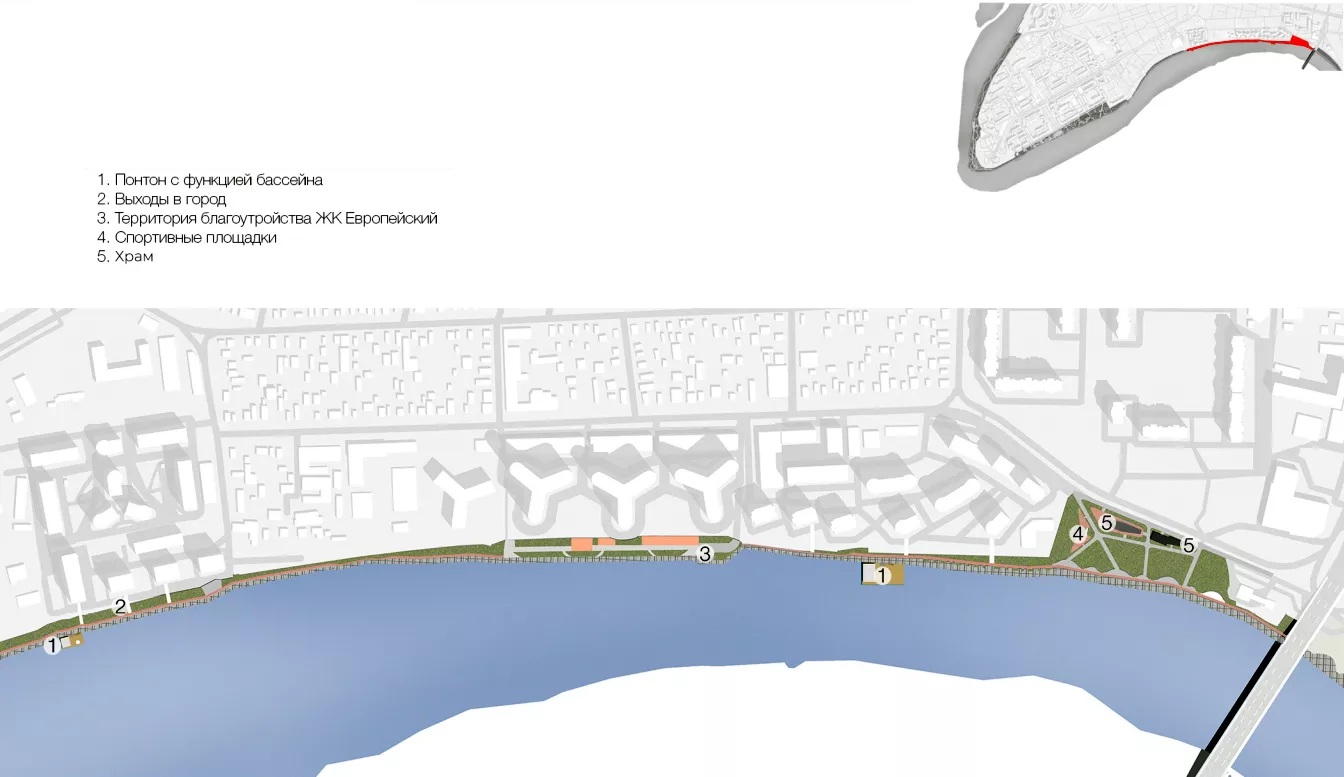 Перед многоэтажками в левой нижней части этого снимка должен в перспективе появиться еще один понтон/бассейн/кафе. А на пустыре между многоэтажками и заправкой будут соседствовать храм и скейт-площадка. Интересно, конечно, как аудитория этих двух объектов уживется друг с другом.