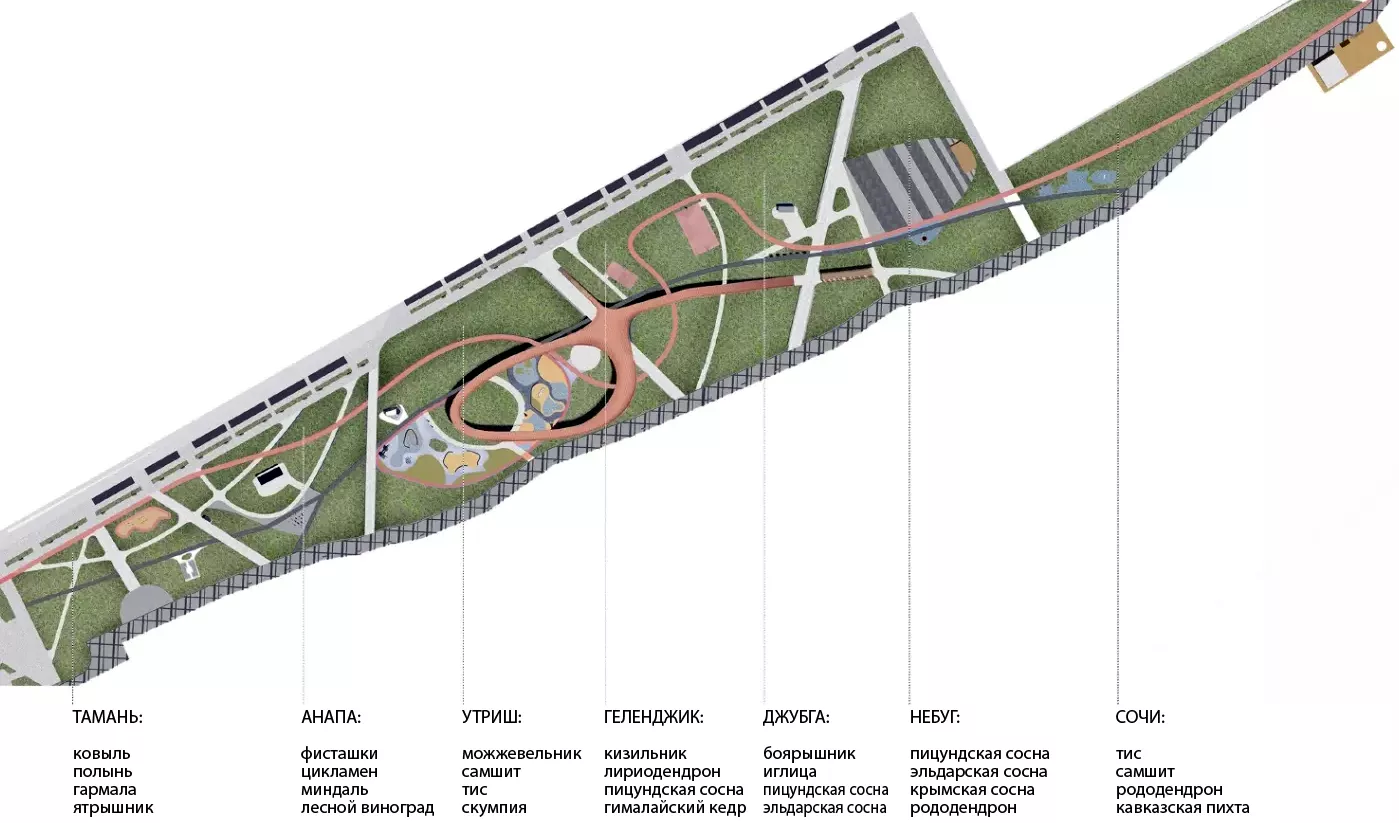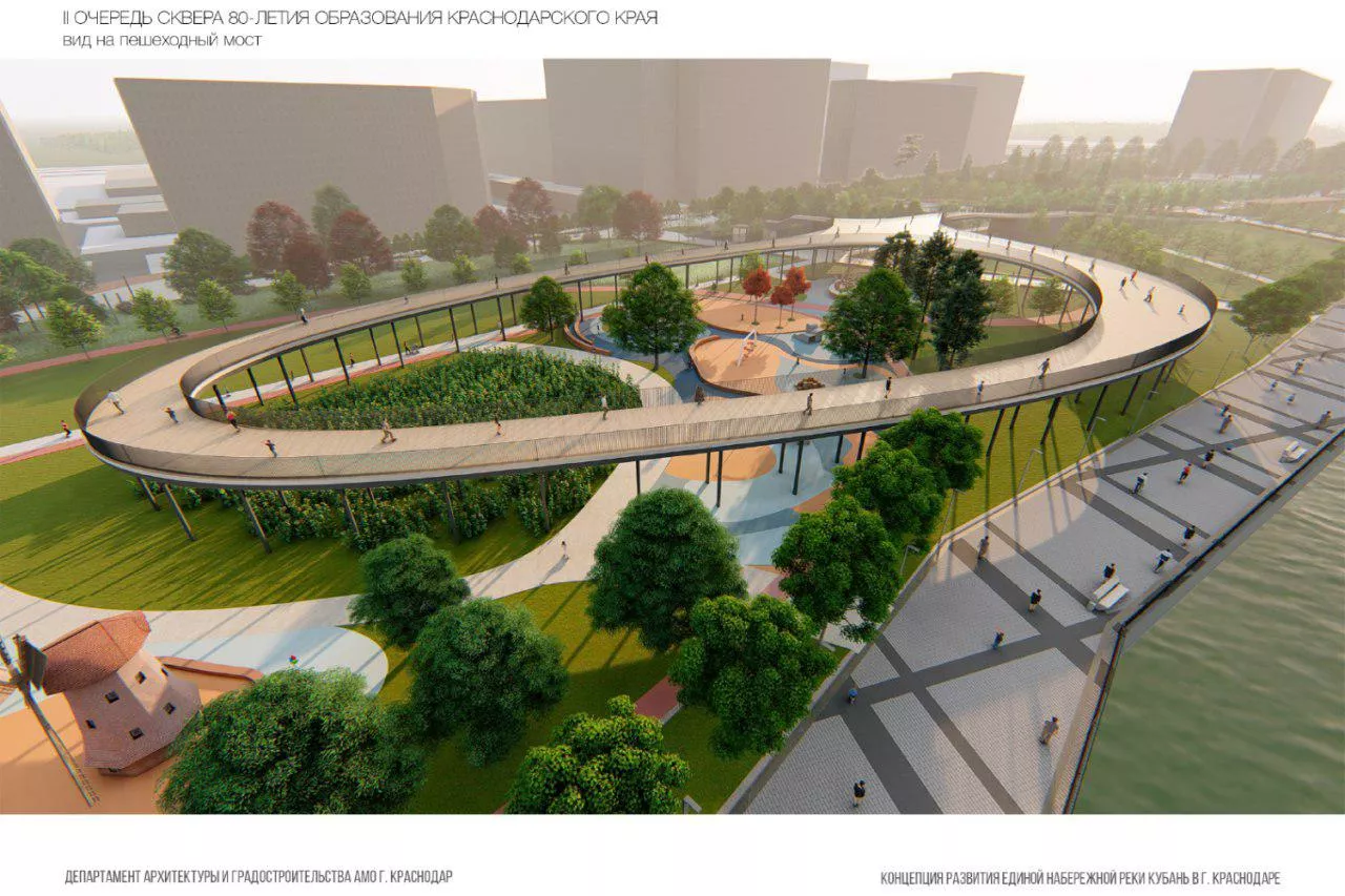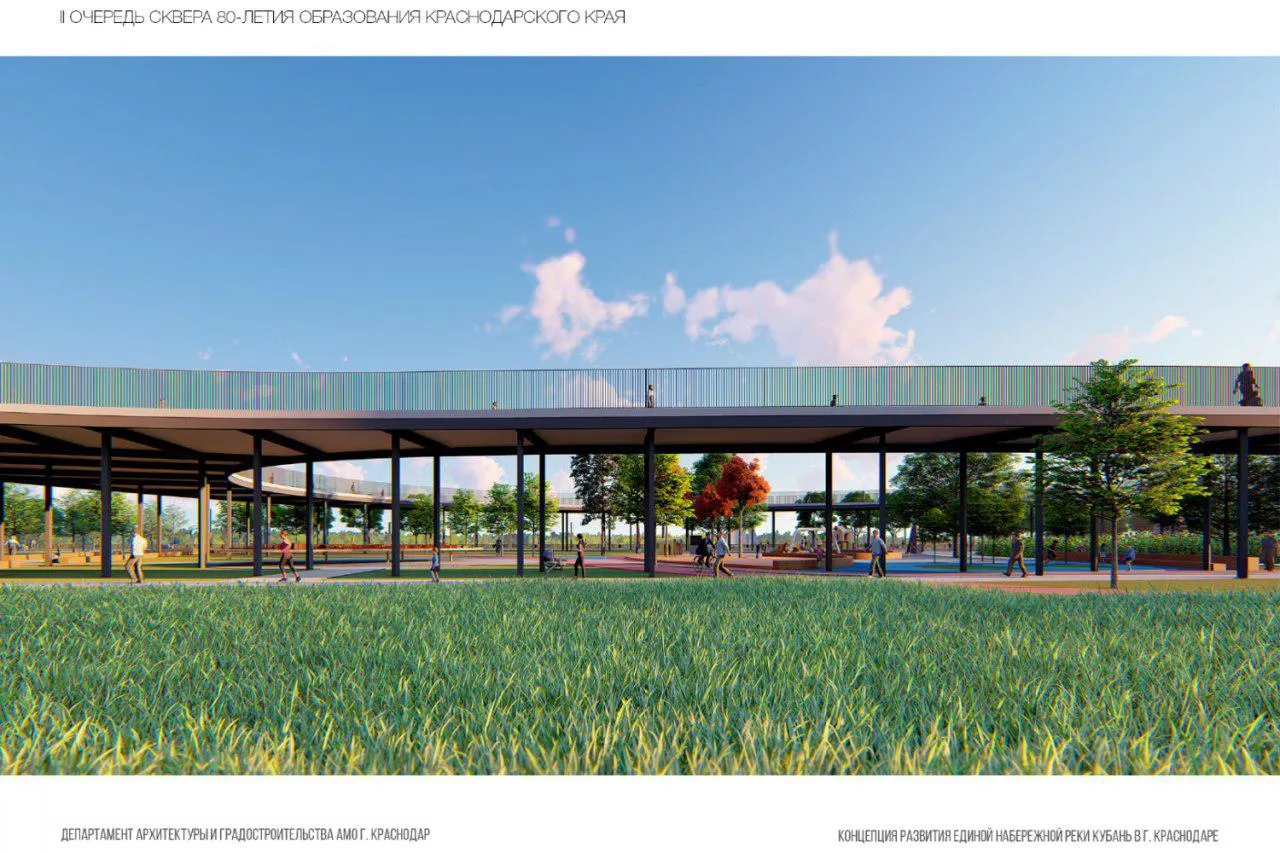 Согласно проекту, классическому прикубанскому пейзажу (поляне с тенистыми овражками) предстоит перевоплотиться в полноценного конкурента парку «Краснодар» — вычурного и полного открытий чудных: подсолнухового лабиринта, солнечных часов, бронзового макета Краснодарского края и еще не менее трех арт-объектов. Озеленение территории будет имитировать Черноморское побережье — от таманских ковылей в западной части отрезка до адлерских пихт в восточной. Над всем этим великолепием будет выситься архитектурная доминанта — петлеобразная пешеходная галерея, которая наверняка вызовет некоторое дежавю у тех, кто бывал в столичном «Зарядье».
