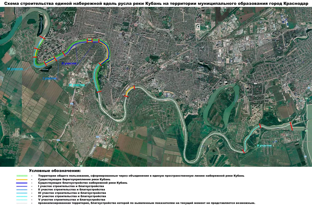Еще через несколько месяцев мэрия обнародовала объемистую «Концепцию развития единой набережной реки Кубань в г. Краснодаре». Из этого весьма любопытного документа следует, в частности, что муниципалитет всерьез рассматривает планы одеть в гранит берега Гидростроя (см. «участок V» на следующем слайде).