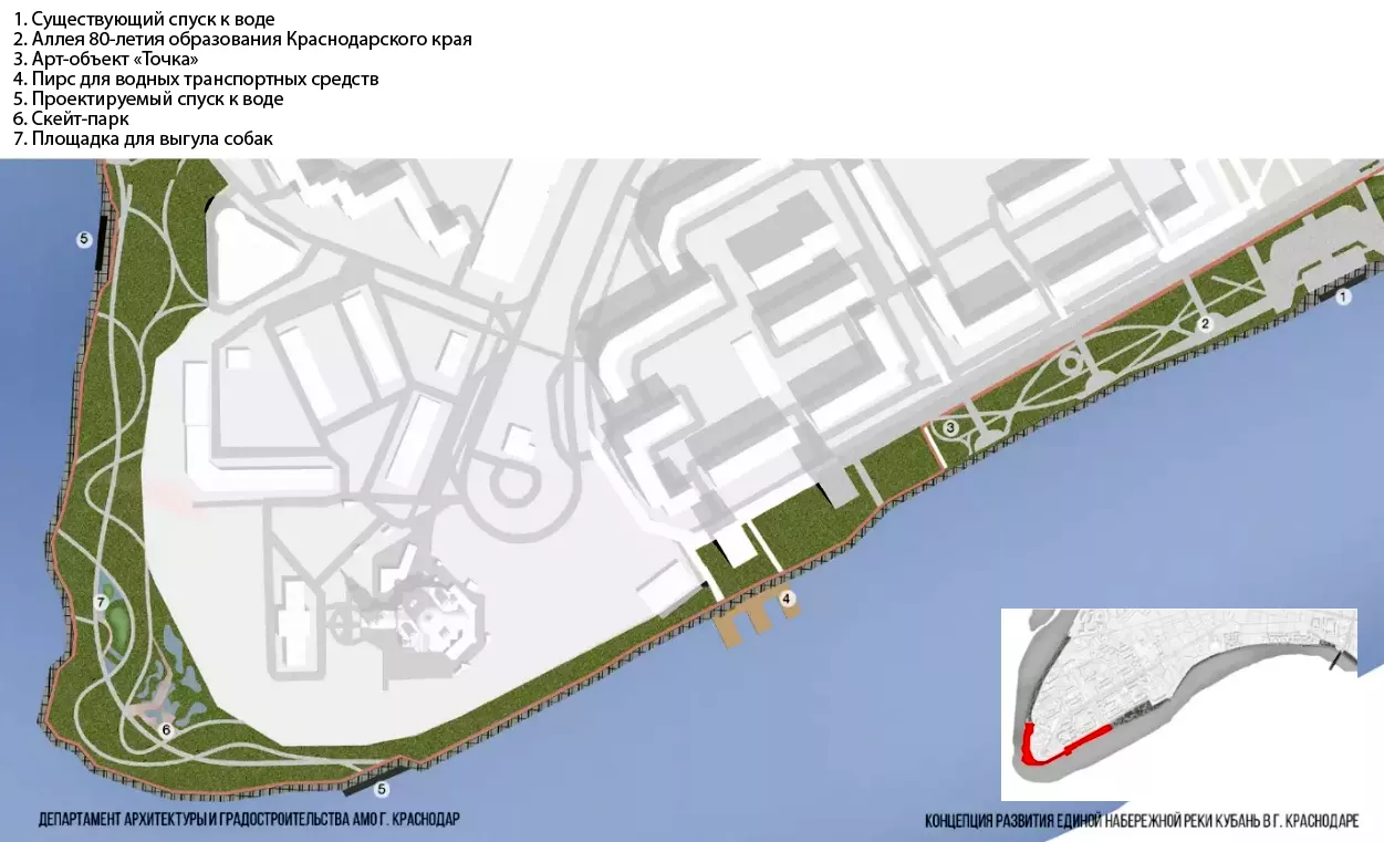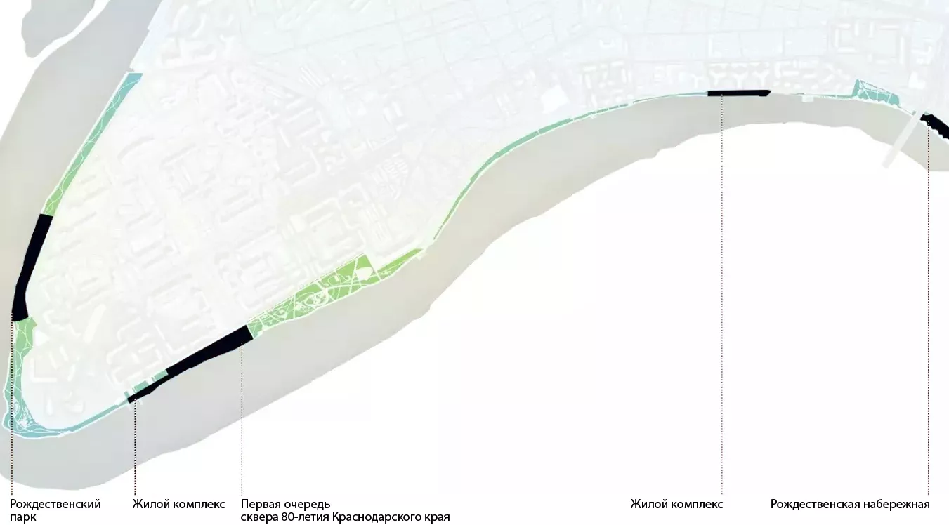 Первым этапом проекта заявлено облагораживание второй очереди «Аллеи в честь 80-летия образования Краснодарского края». Это полоса примерно в 100 метров шириной от Платанового бульвара до дома № 51 на Рождественской набережной.